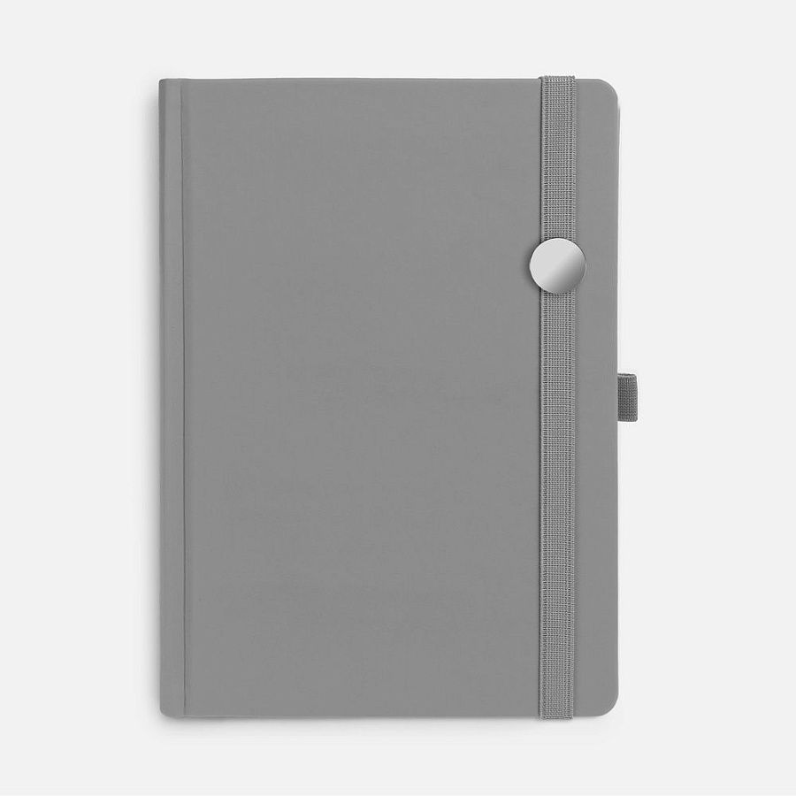 Ежедневник с твердой обложкой без поролона, выполнен из материала Soft Touch, серый СС, дополнен резинкой шириной 1 см, петлей-резинкой для ручки, капталом и ляссе серого цвета.
