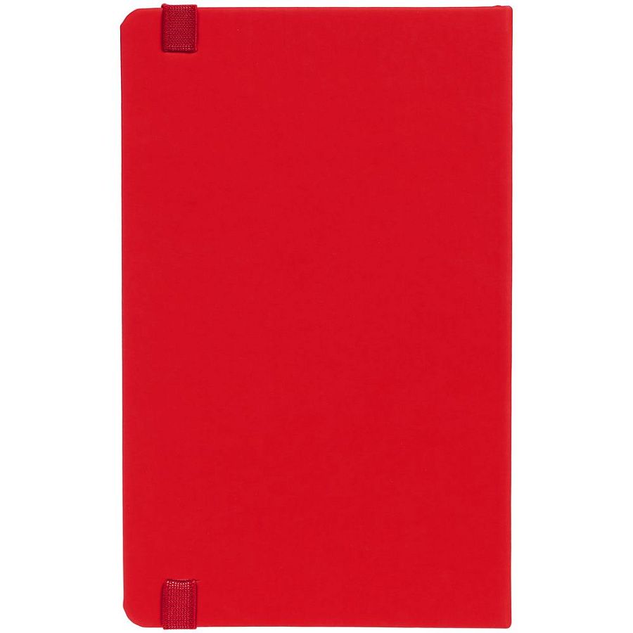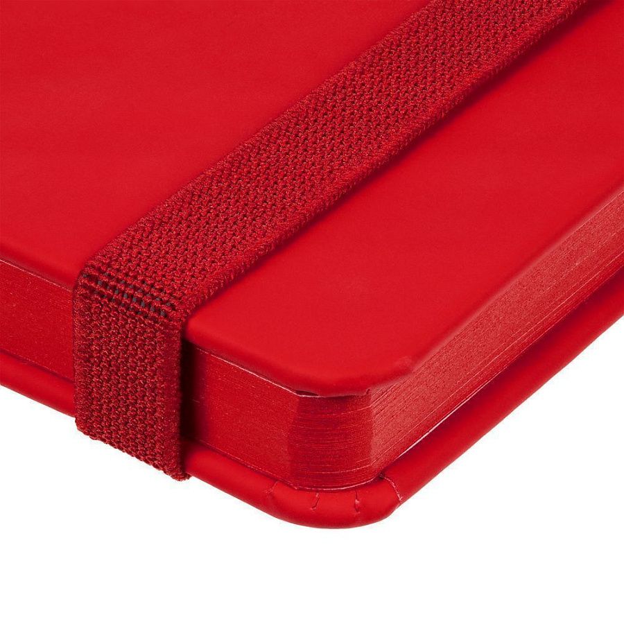 Блокнот в твердой обложке, выполнен из материала Soft Touch Ultra, красный РР, дополнен резинкой и ляссе в цвет обложки.