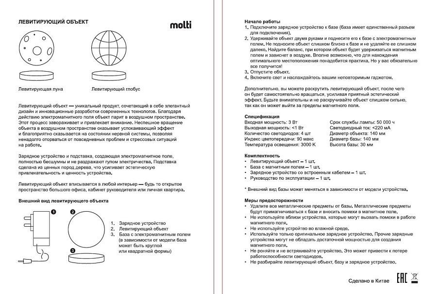 Левитирующая луна MoonFlight сочетает в себе элегантный дизайн и инновационные разработки современных технологов. Благодаря действию электромагнитного поля луна завораживающе парит в воздухе, мгновенно притягивая к себе заинтересованные взгляды. В офисе или дома она может стать прекрасным антистрессом: ее неспешное вращение вокруг своей оси легко успокаивает и позволяет ненадолго оторваться от повседневных проблем и стрессовых ситуаций.