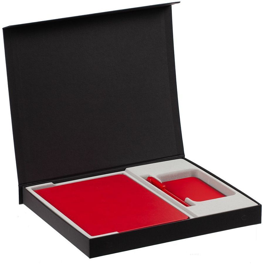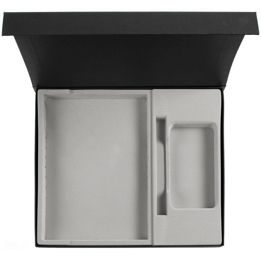 Коробка из переплетного картона, кашированного фактурной дизайнерской бумагой Efalin, с крышкой на магните и флокированным ложементом.