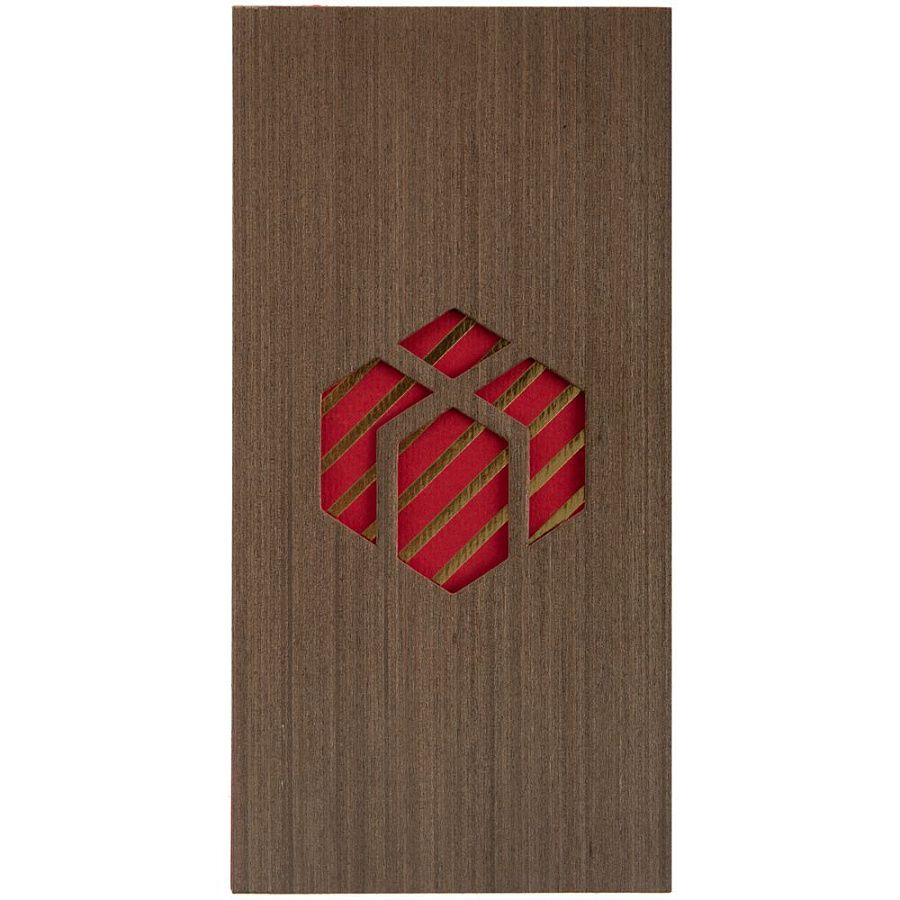 Под сдержанной обложкой из шпона венге скрывается настоящая праздничная феерия — яркая дизайнерская бумага, тисненая фольгой.