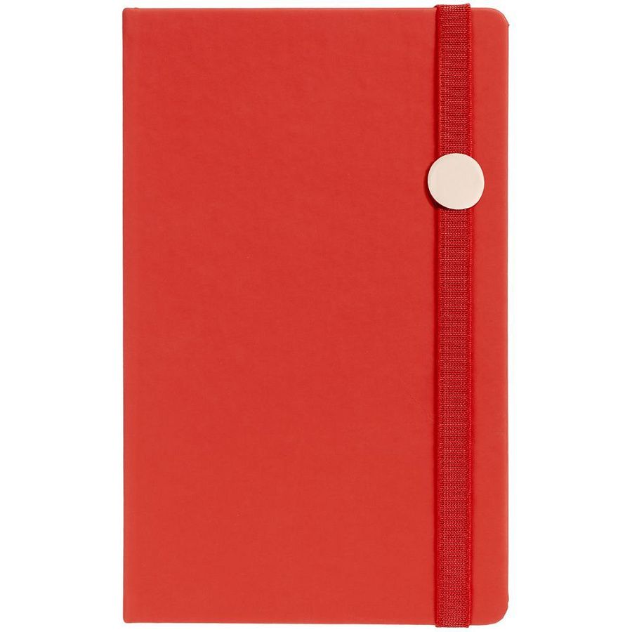 Блокнот в твердой обложке, выполнен из материала Soft Touch Ultra, красный РР, дополнен резинкой и ляссе в цвет обложки.