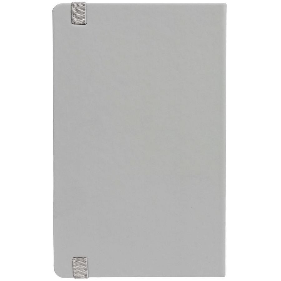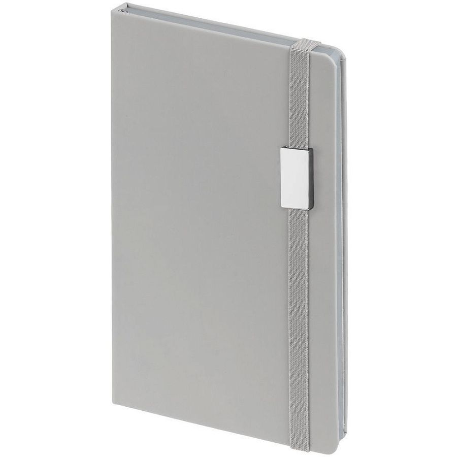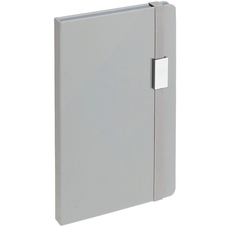 Блокнот в твердой обложке, выполнен из материала Soft Touch, серый СС, дополнен резинкой и ляссе в цвет обложки.
