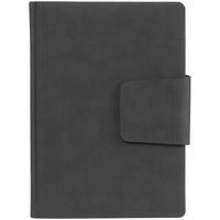 Ежедневник с твердой обложкой c поролоном, выполнен из материала Nubuck, темно-серый ЕЕ, дополнен капталом и ляссе черного цвета. Застежка — магнитный хлястик.