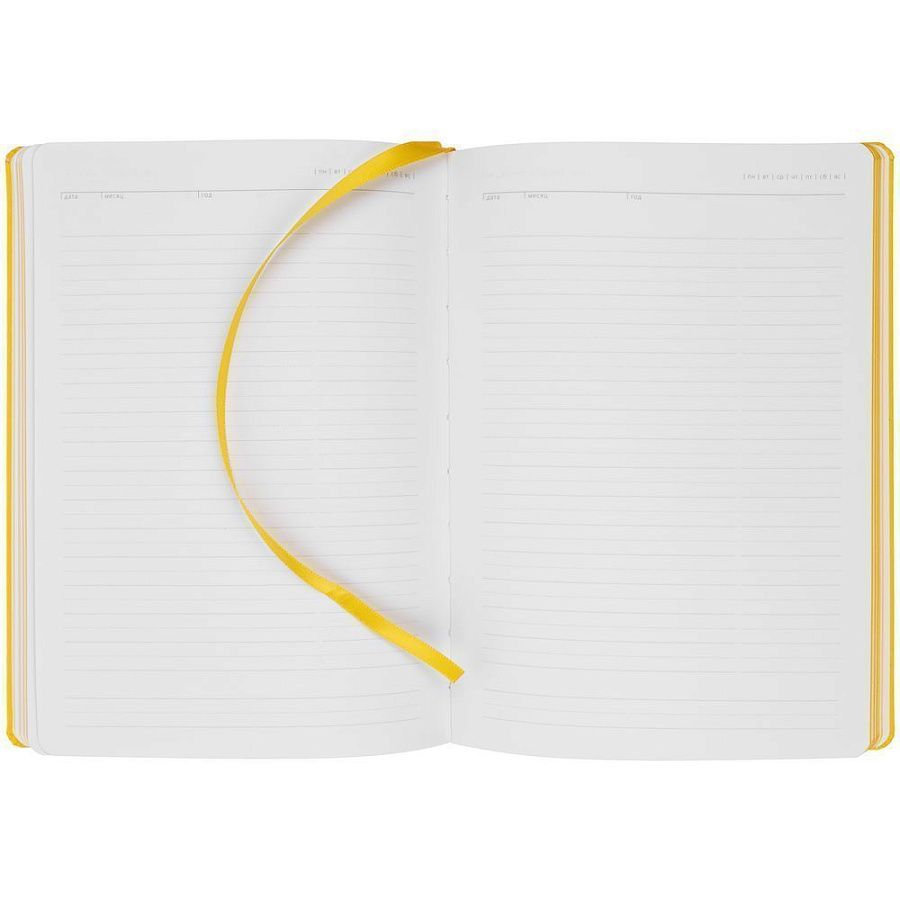 Ежедневник с твердой обложкой и тонированным обрезом. Выполнен из материала Latte, желтый, дополнен ляссе в цвет обложки.