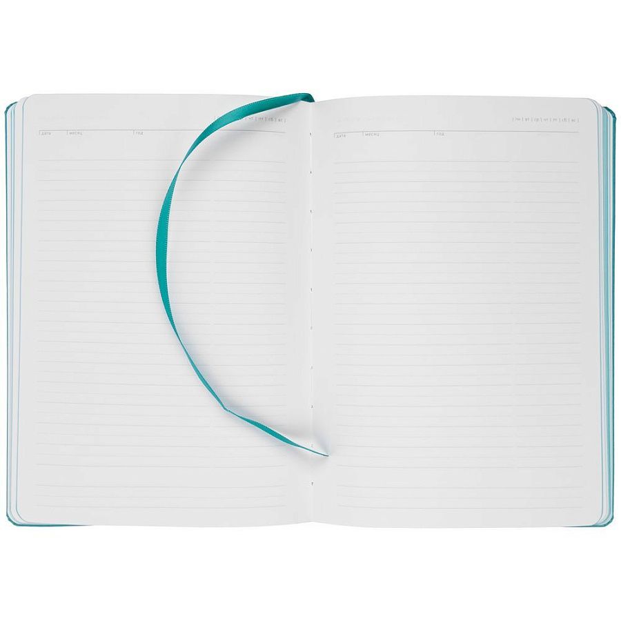 Ежедневник с твердой обложкой и тонированным обрезом. Выполнен из материала Latte, бирюзовый, дополнен ляссе в цвет обложки.