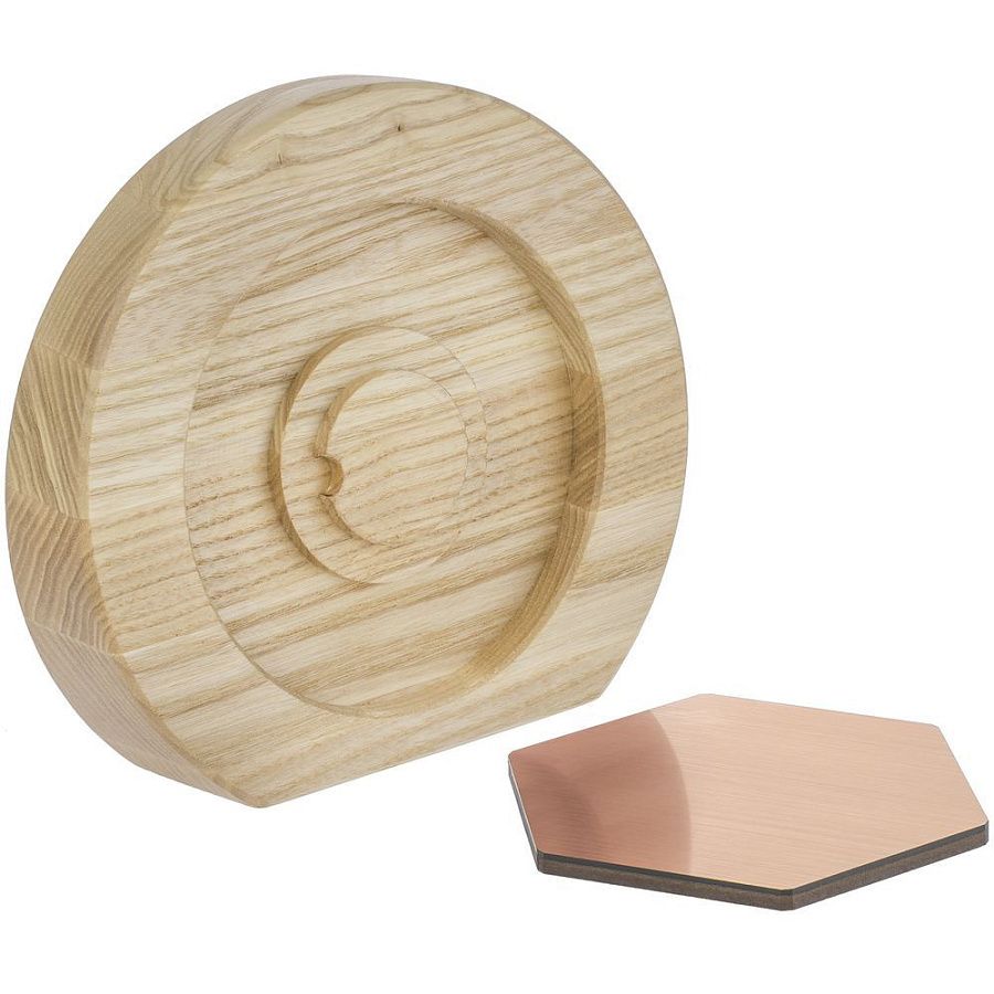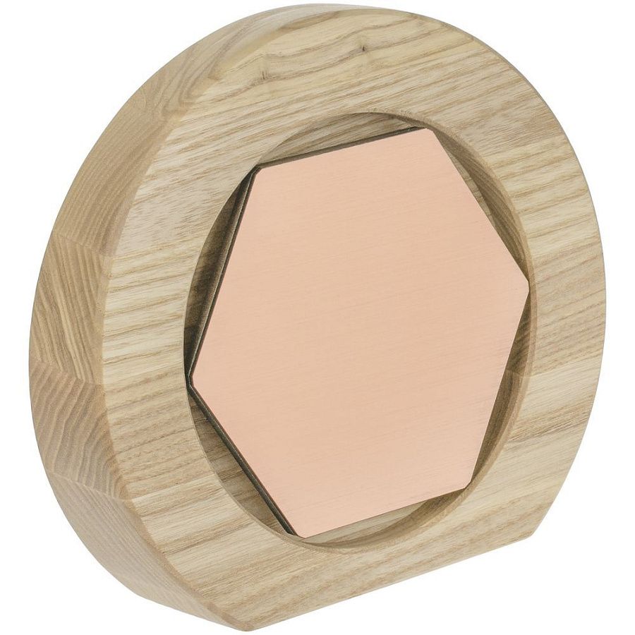 Вставка с шестигранником из зеркального пластика на деревянной основе крепится на приподнятое основание внутри стелы, что создает объем и многослойность награды. На вставке предусмотрен клеевой слой для крепления после нанесения.