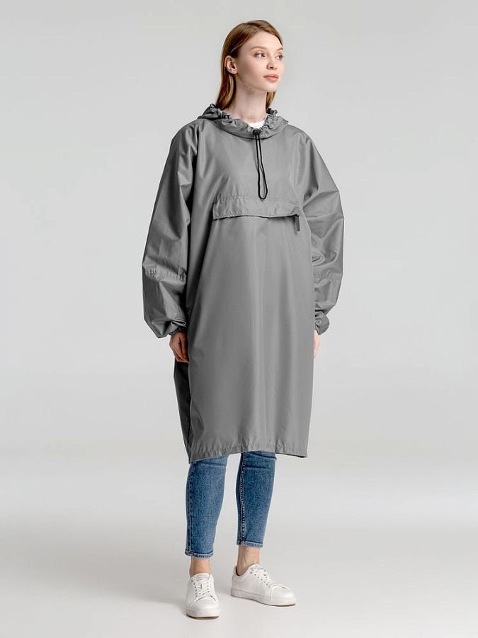 Дождевик-анорак с капюшоном и карманом на молнии спереди. Выполнен из ткани дюспо с матовой поверхностью — легкой, мягкой на ощупь, но устойчивой к повреждениям. Она не шелестит и практически не мнется. Благодаря пропитке дюспо обладает отличными водоотталкивающими и ветрозащитными свойствами.