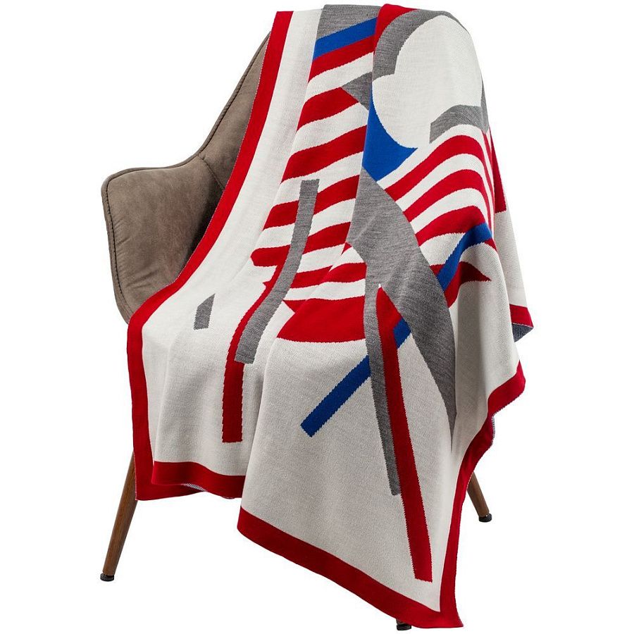 Плед с вывязанным логотипом и индивидуальным рисунком в фирменной цветовой гамме.