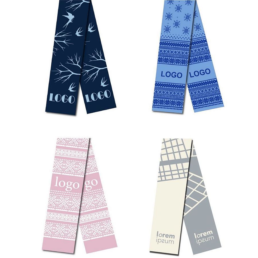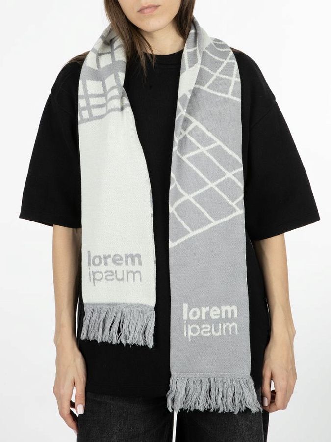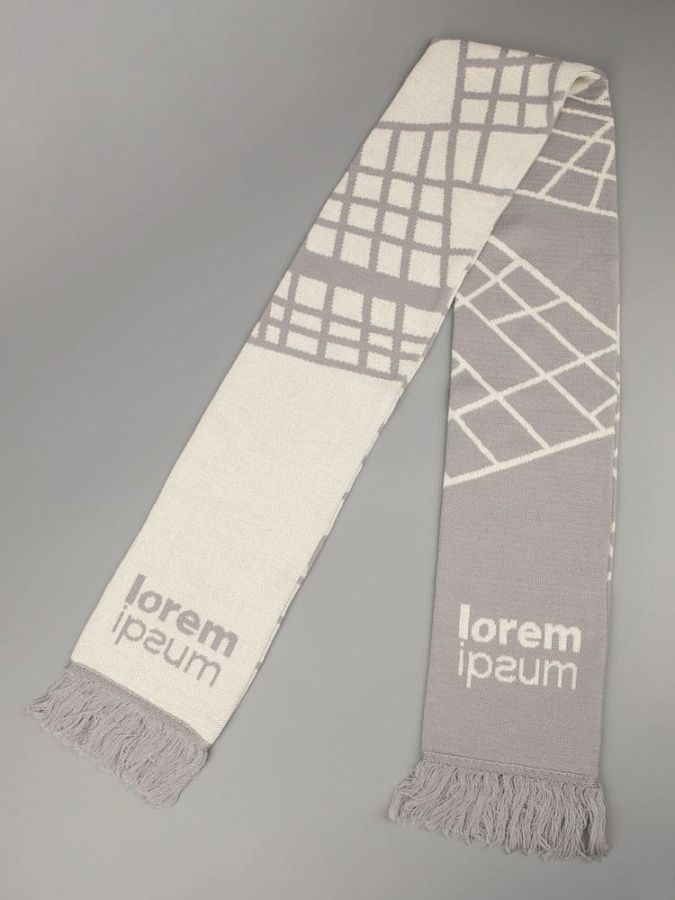 Шарф с вывязанным логотипом и индивидуальным рисунком в фирменной цветовой гамме.