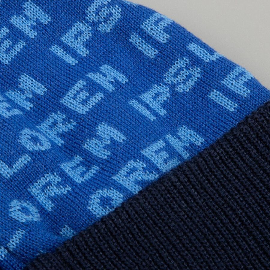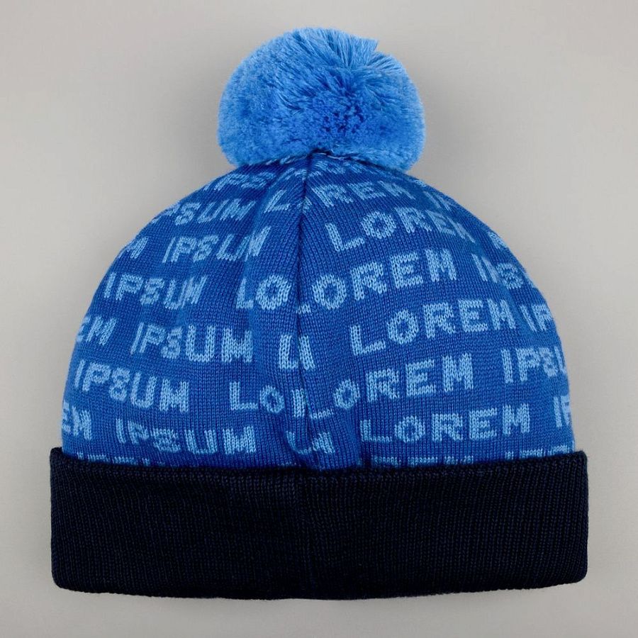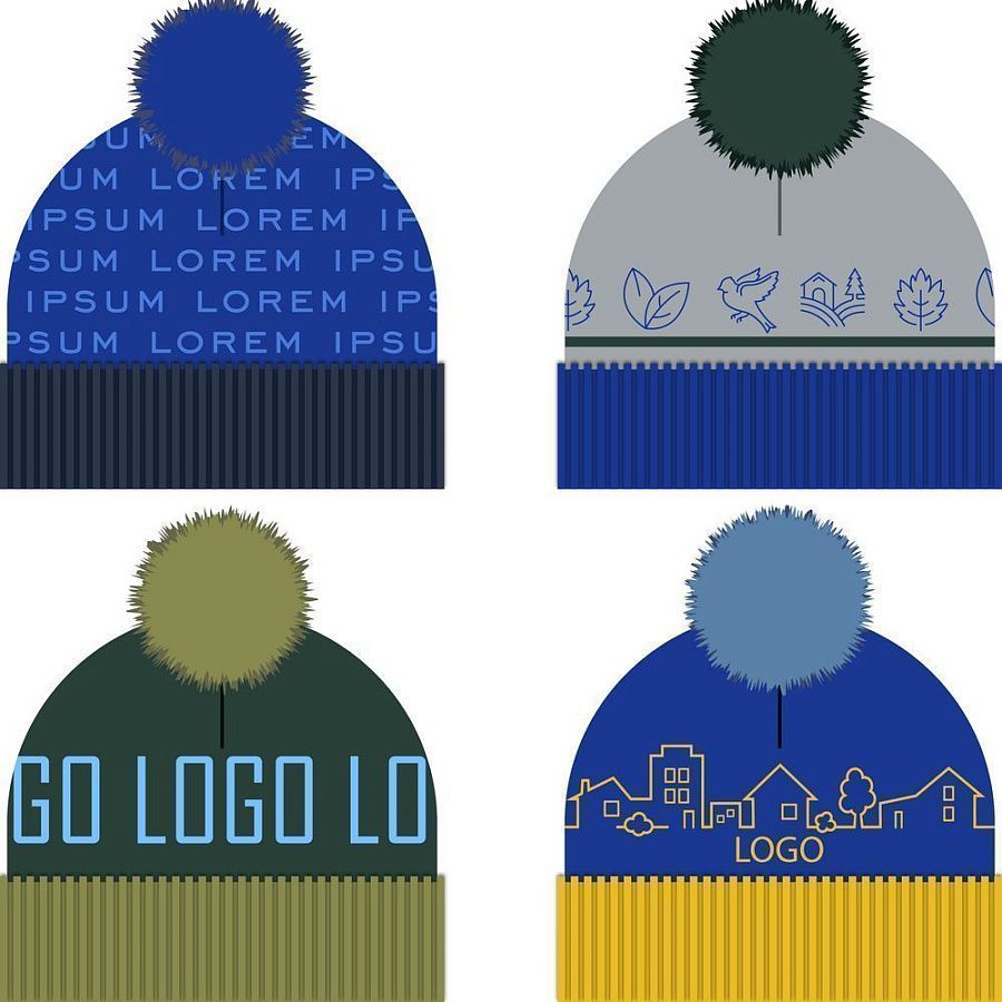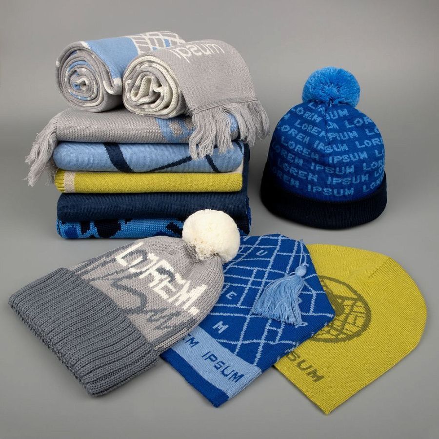 Шапка с вывязанным логотипом и индивидуальным рисунком в фирменной цветовой гамме.
