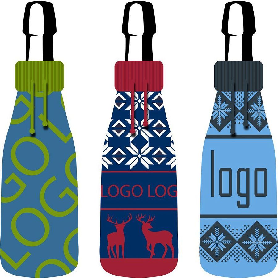 Чехол на бутылку с вывязанным логотипом и индивидуальным рисунком в фирменной цветовой гамме. Такой чехол легко превратит любую бутылку в оригинальный подарок.