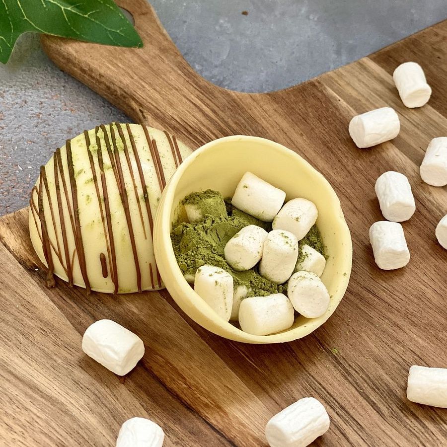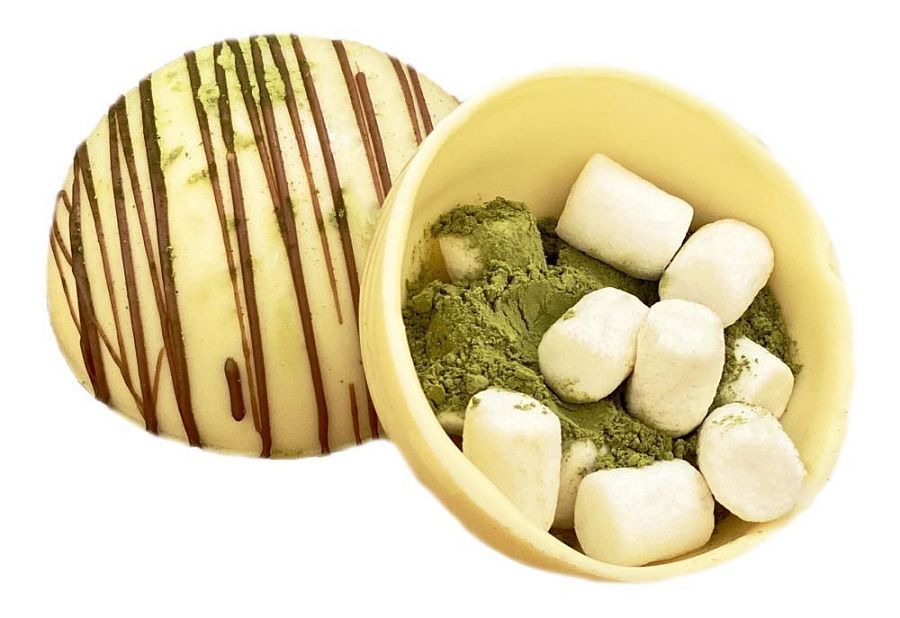 Состав: сфера из белого шоколада, чай матча, маршмеллоу.