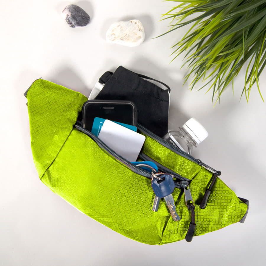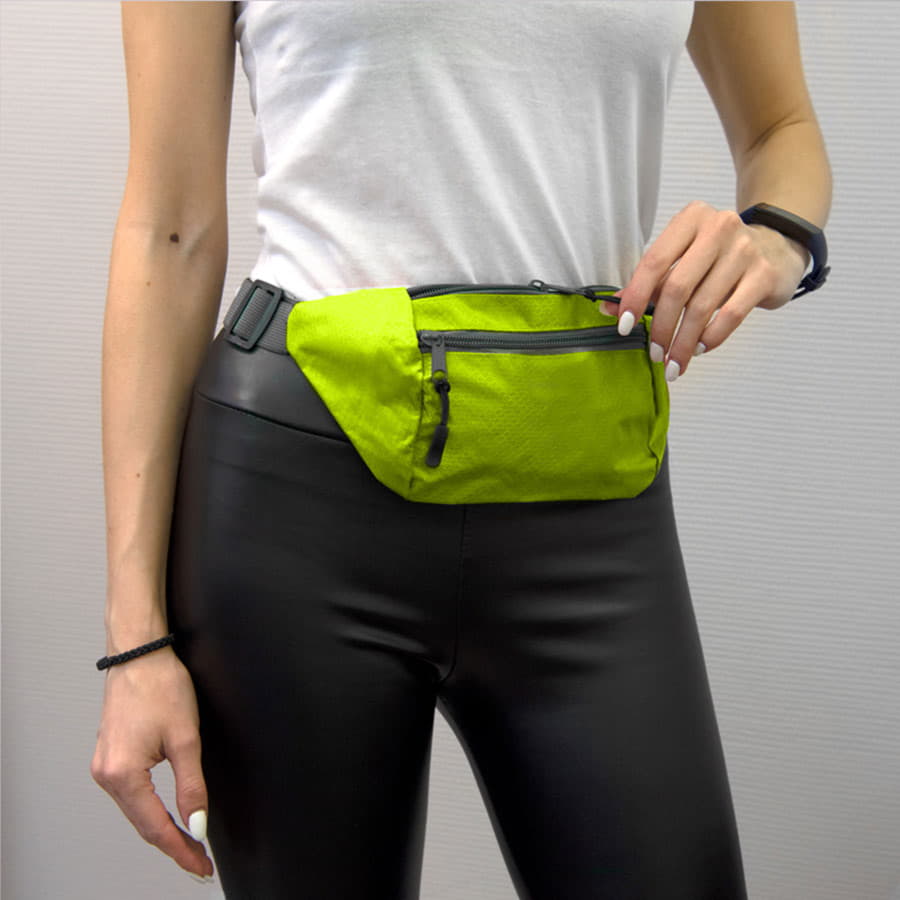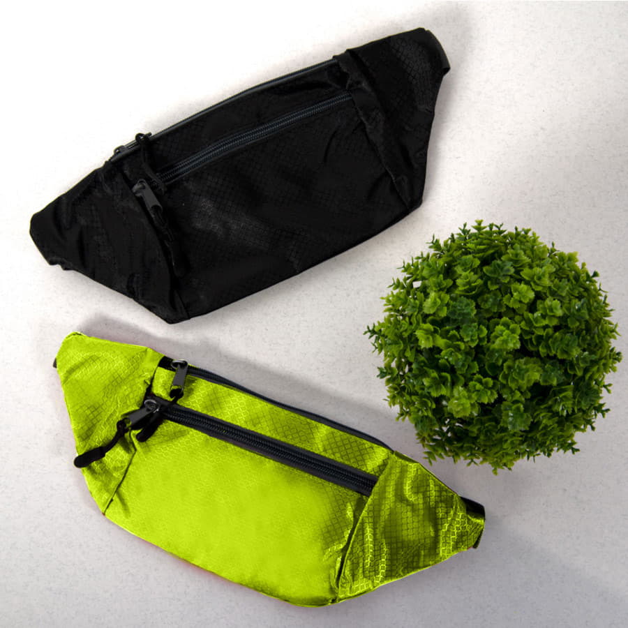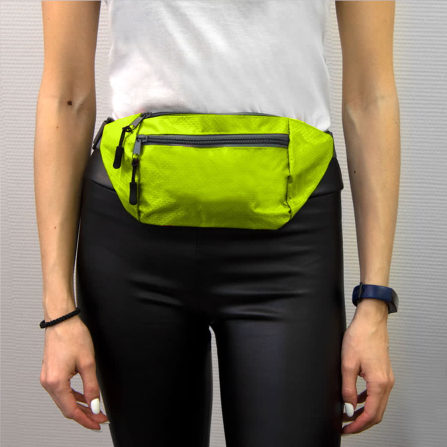 Поясная сумка из интересного материала рипстоп отлично подойдет для прогулок или занятий на свежем воздухе. Рипсто́п (от англ. ripstop) — тип ткани, в структуре которого использована упрочнённая армированная нить из нейлона. Сумки из такого материала прочные, но легкие, с интересным дизайном поверхности материала, напоминающим медовые соты. Сумка с двумя отделами на молнии для удобства хранения небольших, но важных вещей. Крепится на регулируемую широкую стропу с пластиковой застежкой. Упакована сумка в прозрачный пакет