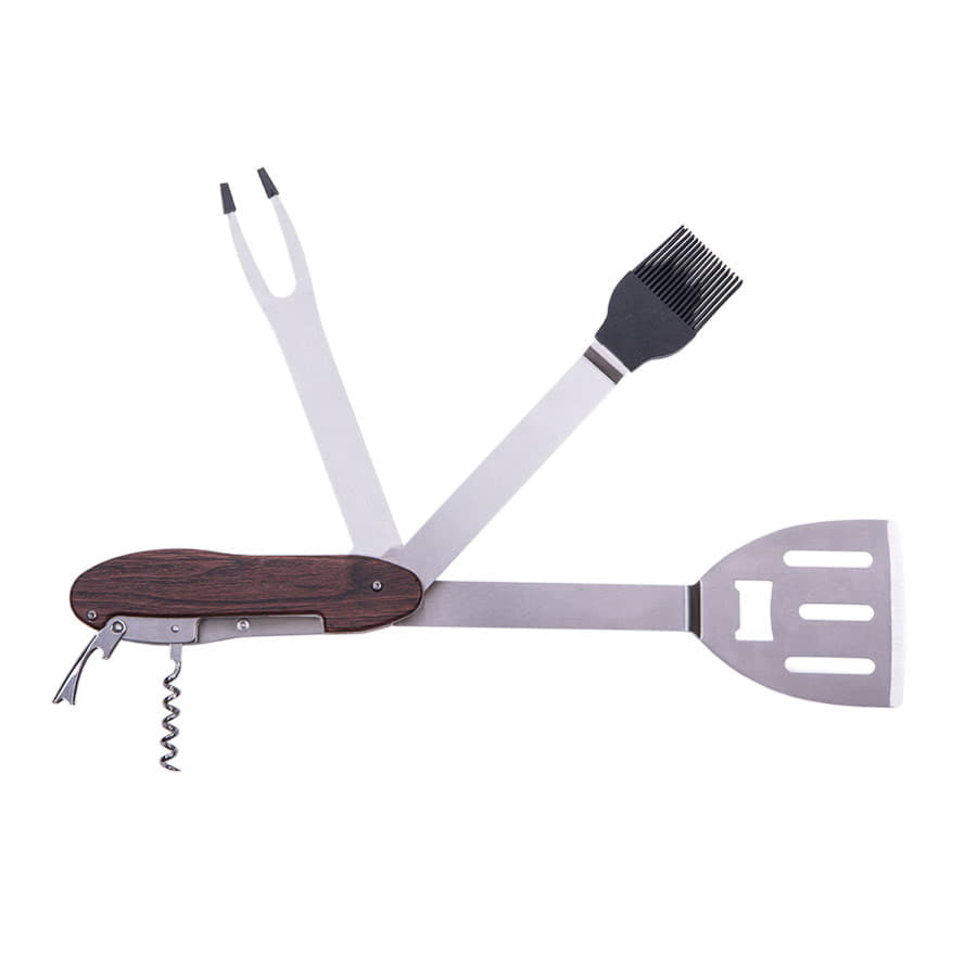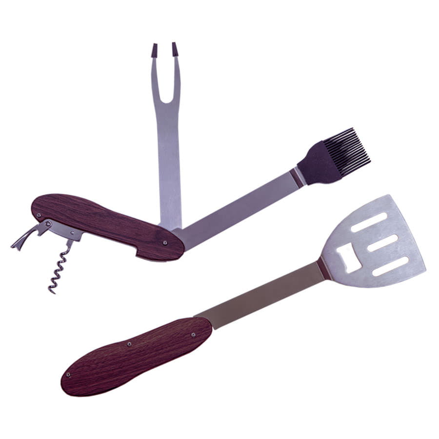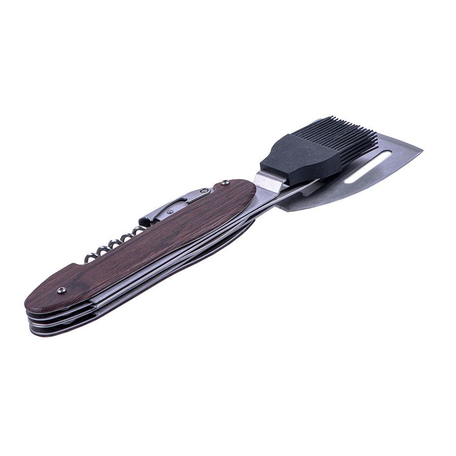 Мультисет для барбекю, 5 функций: 1. Лопатка 2. Вилка для барбекю 3. Силиконовая кулинарная кисть 4. Штопор 5. Открывалка для бутылок Барбекю сет скреплен магнитами в основании ручки, разделив их Вы получите два полноценных инструмента для приготовления блюд. Поставляется в индивидуальной коробке с прозрачным окном и плотным ложементом.