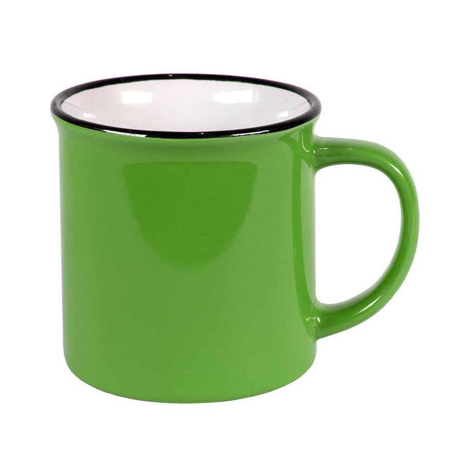 Кружка всем знакомой формы из советского прошлого. Она прочно обосновалась как в рознице, так и на рынке бизнес сувениров. Это своего рода ретро маркетинг, когда продукт имеет эмоциональную ностальгическую привязку к прошлому, к чему то родом из детства. Яркие цвета, черный кант Цвет близкий к Pantone 369-370C