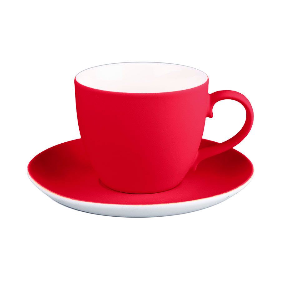 Чайная пара из фарфора с прорезиненным покрытием soft-touchЧашка классической формы и удобное глубокое блюдцеЦвет близкий к Pantone 200CНе рекомендуется мыть в посудомоечной машине