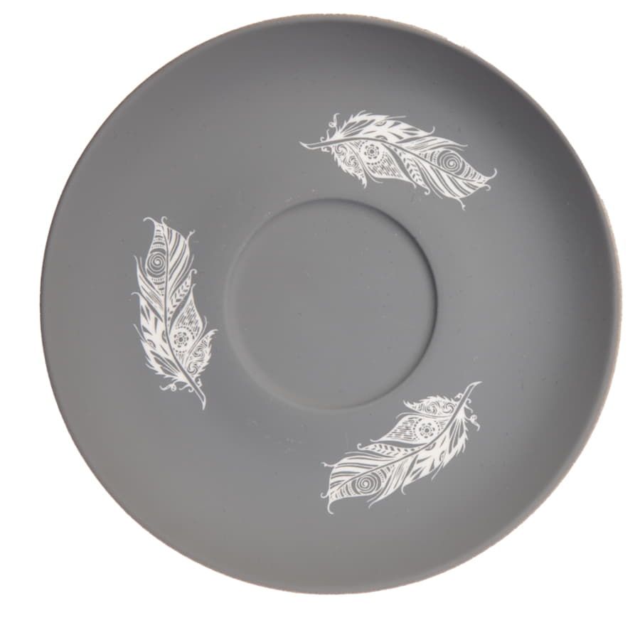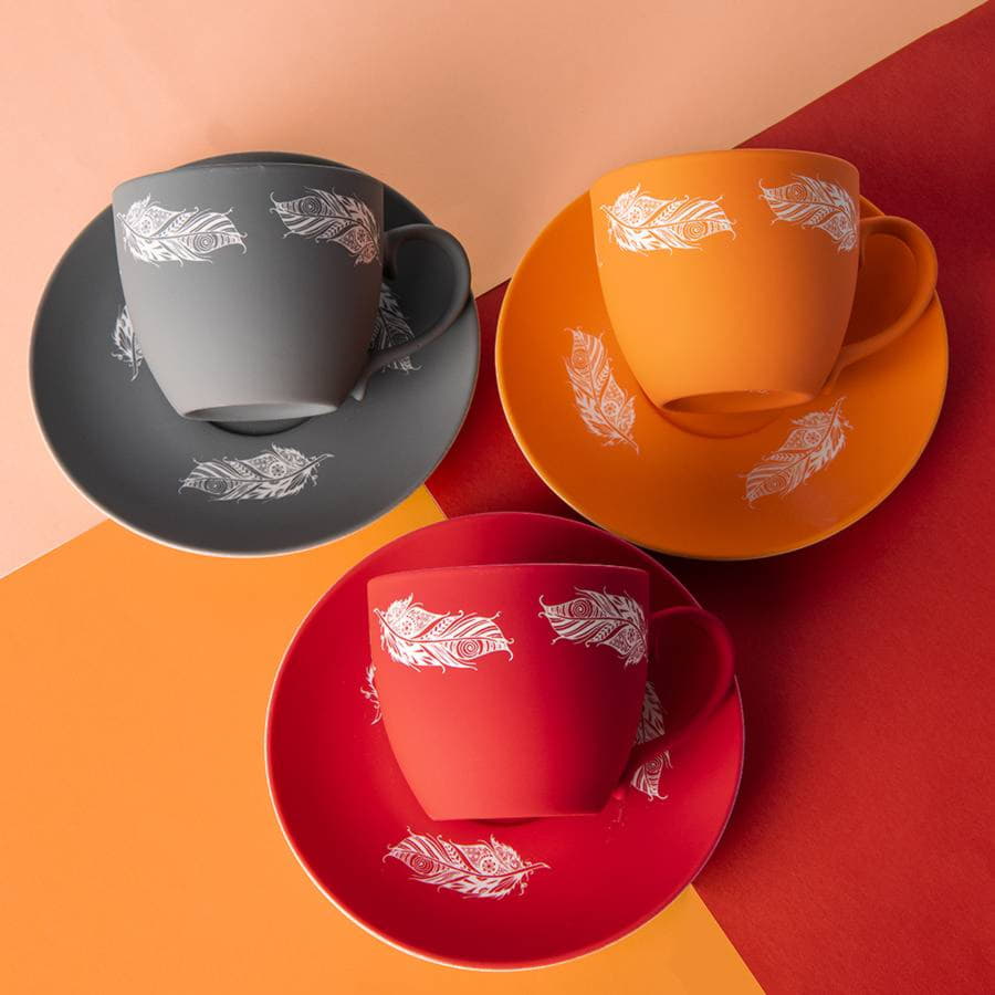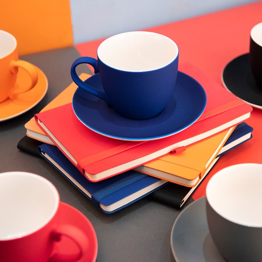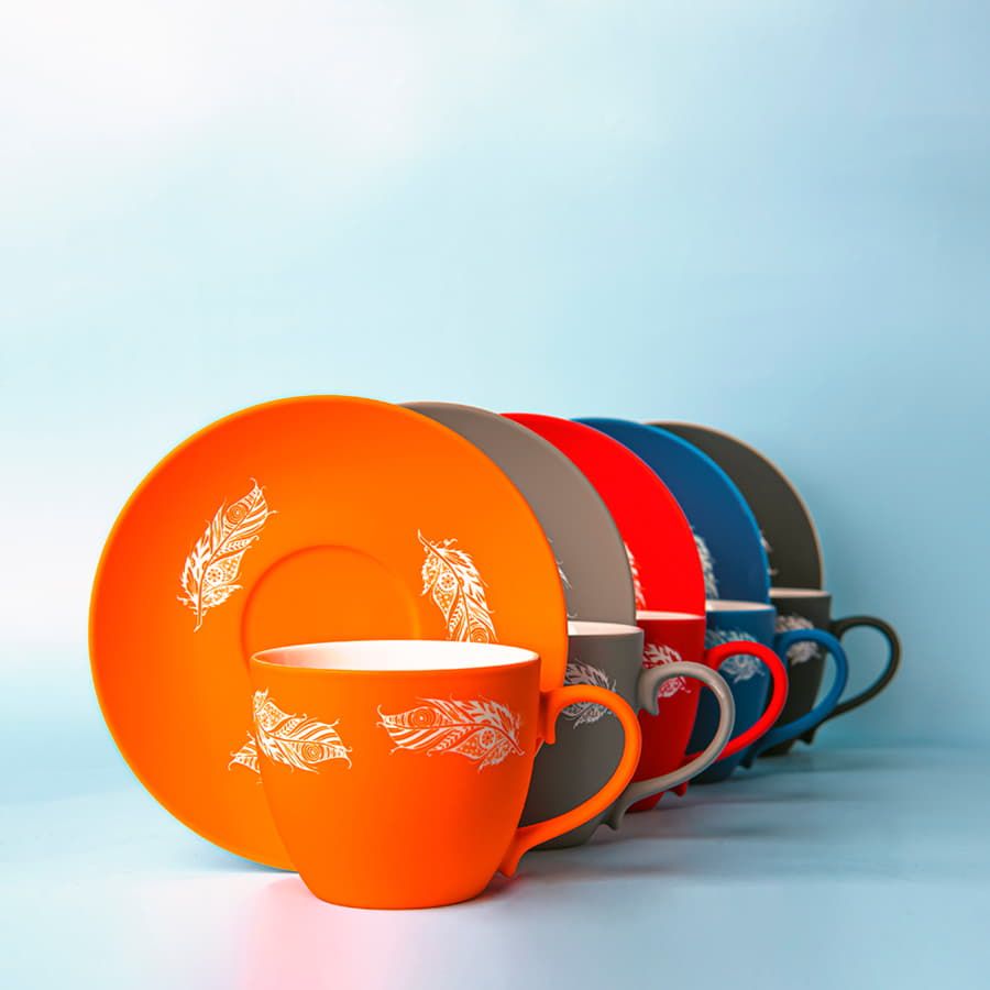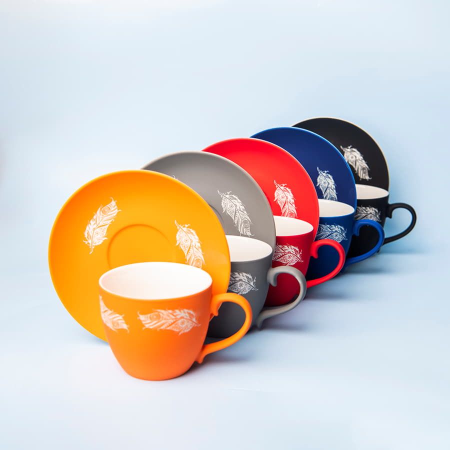 Чайная пара из фарфора с прорезиненным покрытием soft-touchЧашка классической формы и удобное глубокое блюдцеЦвет близкий к Pantone 2333CНе рекомендуется мыть в посудомоечной машине