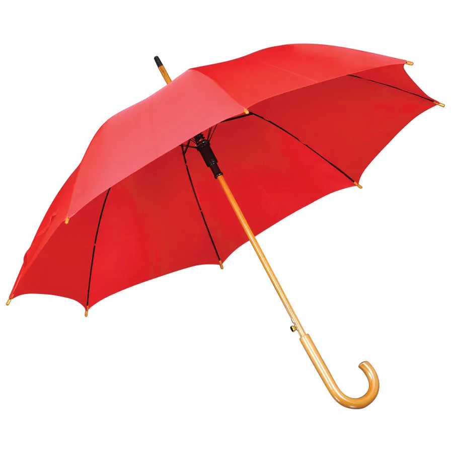 Зонт-трость с деревянной ручкой, полуавтомат. Диаметр купола: 103 см, длина стержня 90 см. Состав купола: 100% полиэстер 190T Состав спиц: металл. Ручка деревянная. Цвет купола: близкий к пантону 186C.