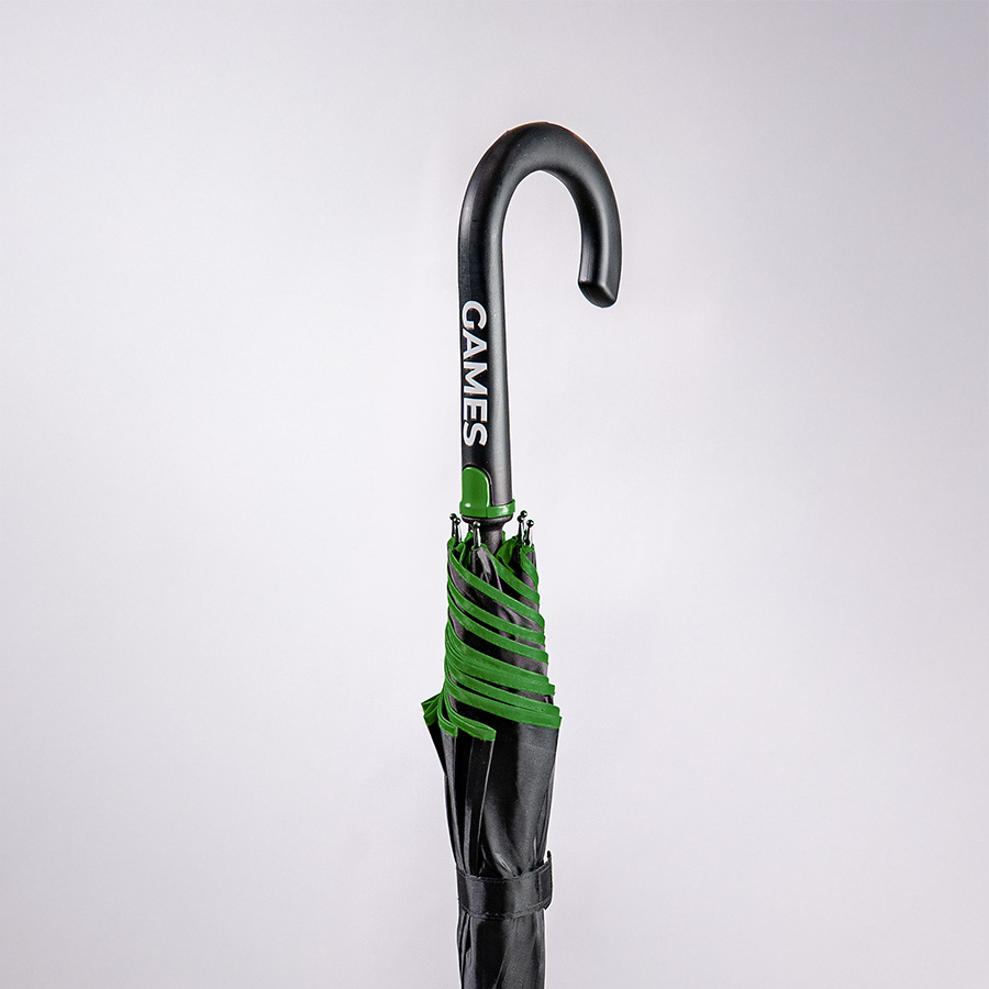Зонт-трость с пластиковой ручкой, полуавтомат.Диаметр купола: 103 см, длина стержня 85 см.Состав купола: 100% полиэстер 190TСостав стержня: металл.Состав спиц: стекловолокно.Ручка пластик. Цвет купола: чёрный + кант зелёного цвета.