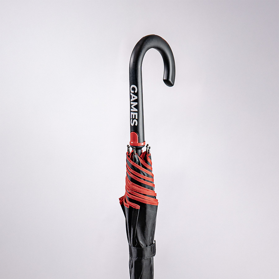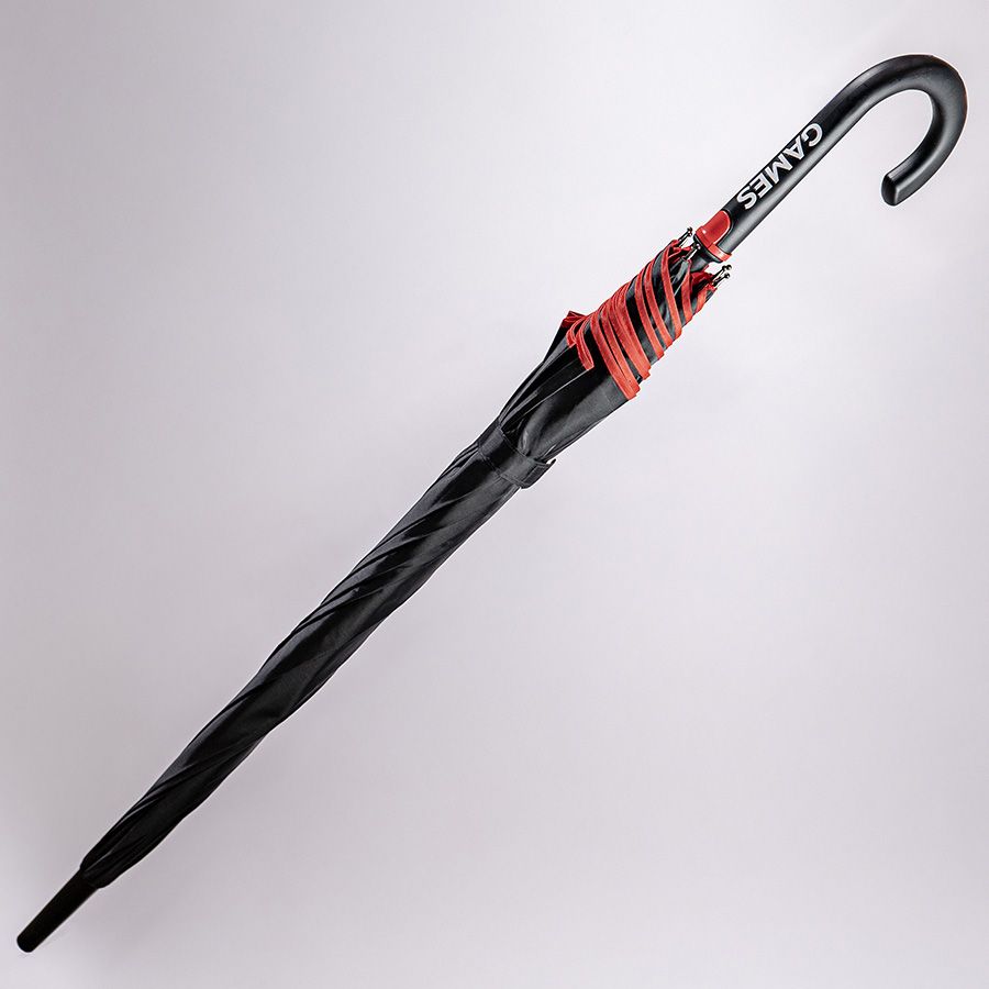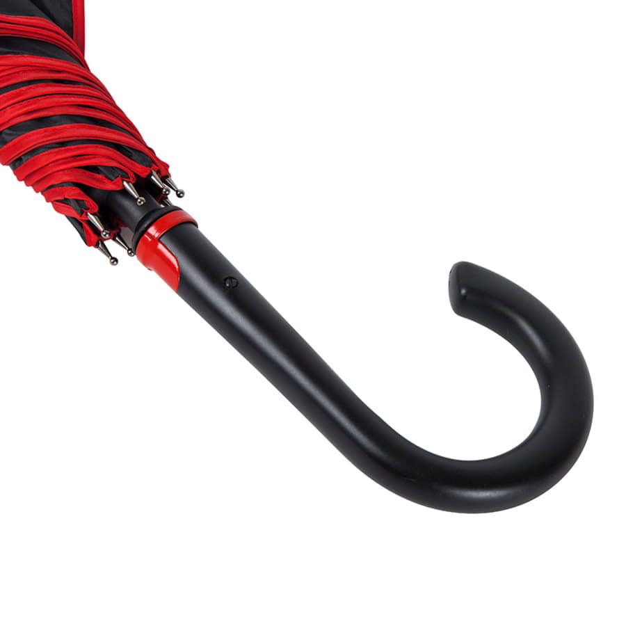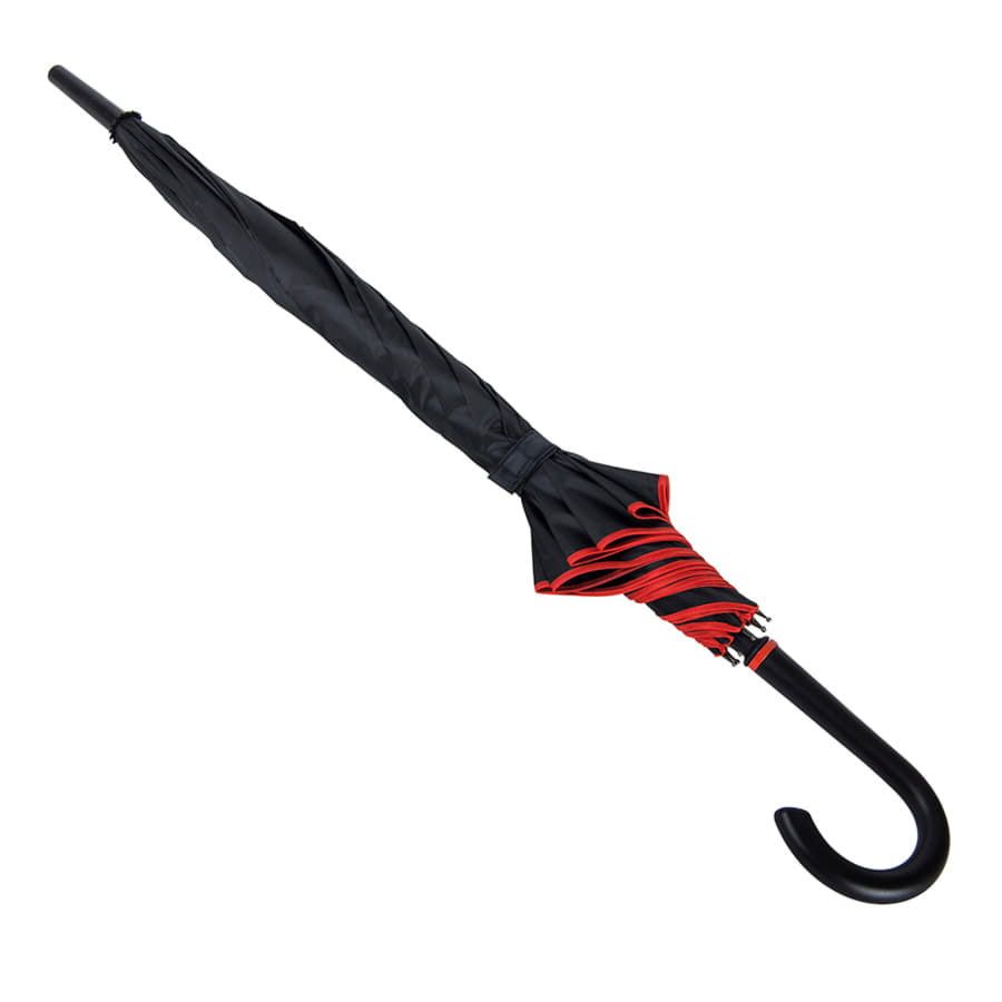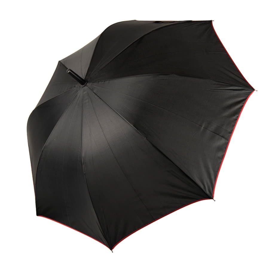 Зонт-трость с пластиковой ручкой, полуавтомат.Диаметр купола: 103 см, длина стержня 85 см.Состав купола: 100% полиэстер 190TСостав стержня: металл.Состав спиц: стекловолокно.Ручка пластик. Цвет купола: чёрный + кант и спицы красного цвета.