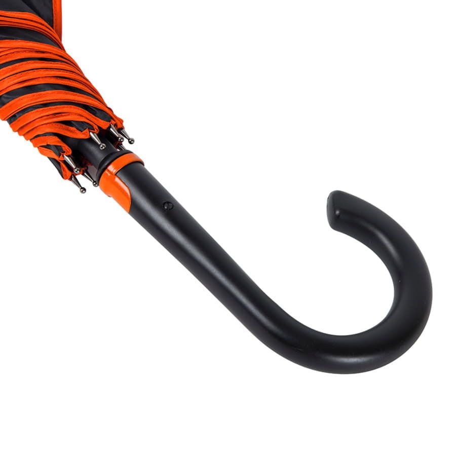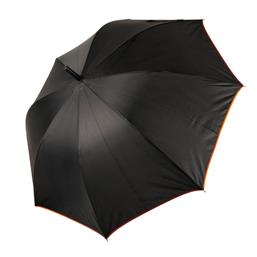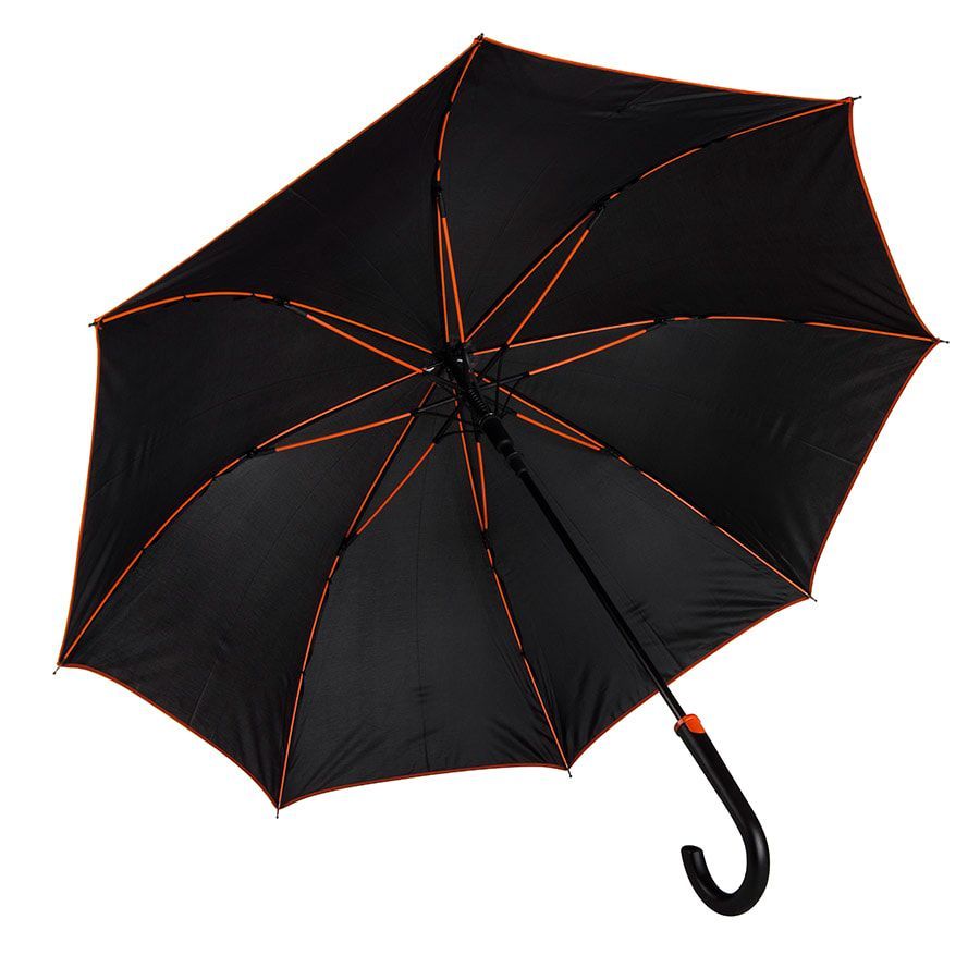 Зонт-трость с пластиковой ручкой, полуавтомат.Диаметр купола: 103 см, длина стержня 85 см.Состав купола: 100% полиэстер 190TСостав стержня: металл.Состав спиц: стекловолокно.Ручка пластик. Цвет купола: чёрный + кант и спицы оранжевого цвета.