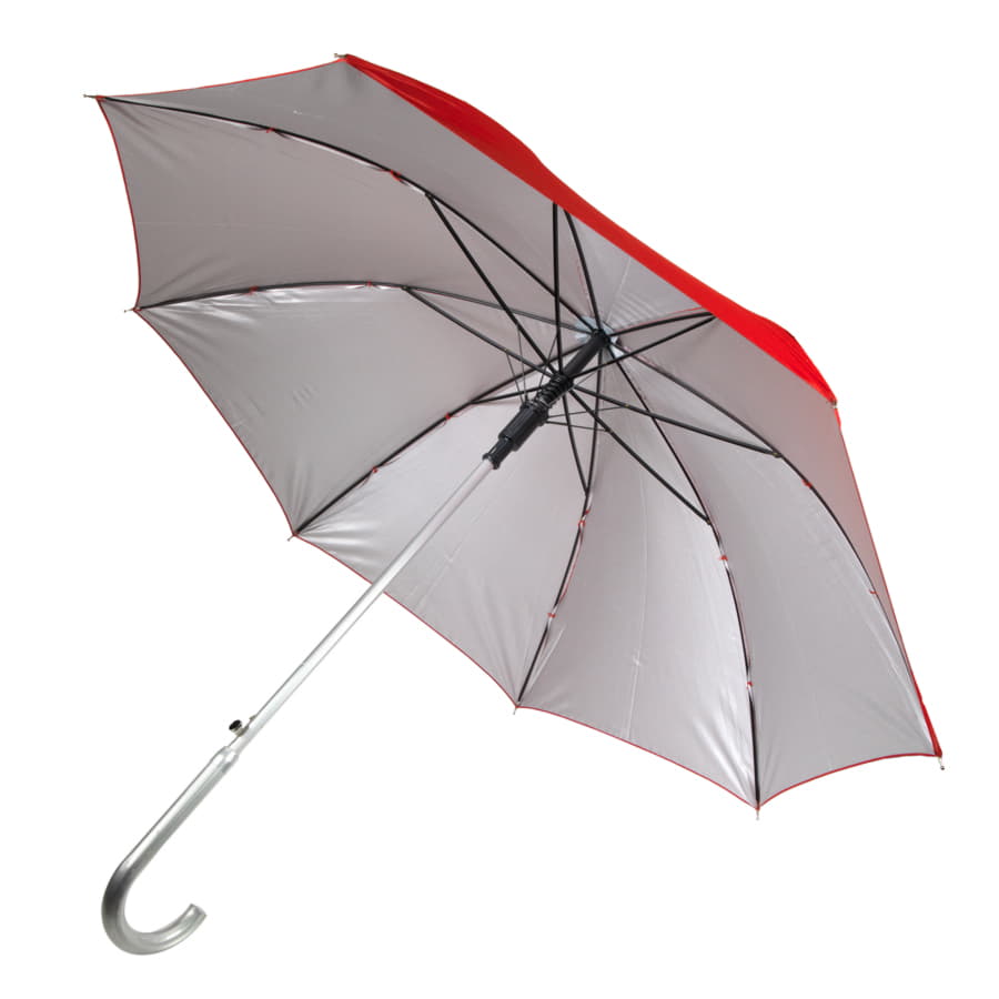 Зонт-трость, полуавтомат.Диаметр купола: 103 см., длина стержня 88,5 см.Состав купола: 100% полиэстер 190TСостав стержня: металл.Состав спиц: металл.Ручка: пластик.Цвет купола: внешняя часть pantone 1805 С, внутренняя часть Pantone 877 С.Двухцветная базовая модель зонта с изюминкой! Внутренняя часть купола серебристого цвета. Упаковка – пластиковый пакет