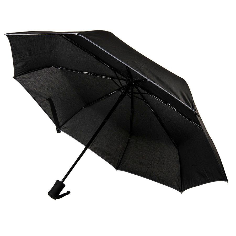 Складной зонт в 3 сложения, автомат.Диаметр купола: 100 см.Состав купола: 100% полиэстер 190T, эпонж.Состав стержня: металл.Состав спиц: металл..Ручка: пластик.По краю купола есть кант из светоотражающего материала.Зонт упакован в чехол из материала + футляр на молнии.