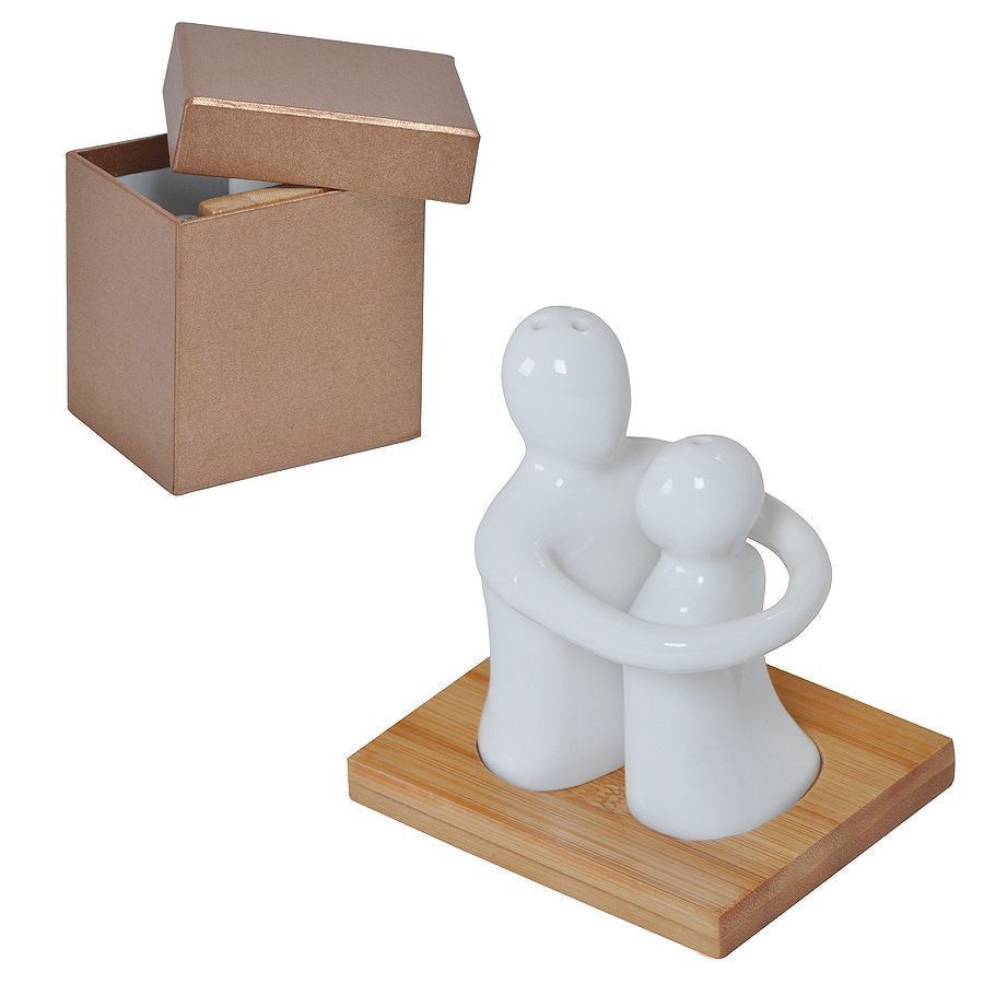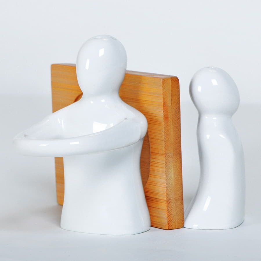 Фарфоровая пара из солонки и перечницы необычной формы символизируют любовь, единение, доверие и привязанность. Ученые говорят, что пять объятий в сутки позволяют зарядиться эндорфинами на весь день, а эндорфины, как известно, повышают иммунитет. Когда люди обнимаются, у них стабилизируется сокращение сердечной мышцы и, как следствие, нормализуется кровяное давление.  Кстати, с 1986 года 21 января отмечается Международный день объятий (International Hug Day). Это ли не повод преподнести актуальный и значимый подарок? Такой дуэт будет эффектно и оригинально смотреться как на домашней кухне, так и в офисе, на деловом завтраке или бизнес-ланче с партнерами, за столом переговоров или корпоративе. Подставка выполнена из бамбука – экологического материала, который отлично подходит для кухонных принадлежностей. В нем сделаны специальные выемки, чтобы эта изящная пара никогда не рассталась, а их совместный танец продолжался вечно. Набор поставляется в подарочной коробке.