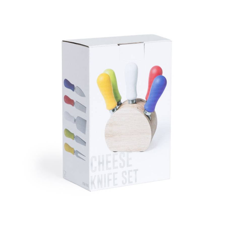Набор для сыра с подставкой из дерева. Принадлежности для резки сыра из нержавеющей стали с яркими пластиковыми ручками (5шт).В набор входят ножи для мягкого и твердого сыра, вилка для сыра и нож для пармезана.Индивидуальная упаковка из картона с изображением продукта