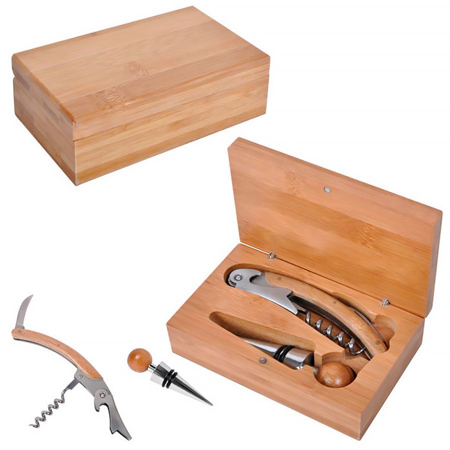 В комплекте: нож сомелье со штопором, пробка Стильный набор для вина в коробочке из бамбука – одного из самых востребованных материалов для кухонных принадлежностей. В комплекте два самых необходимых предмета – нож со штопором и пробка. Благодаря этому благородному комплекту вино будет удобно как открыть, так и хранить, а надежный футляр из натурального материала с гравировкой будет смотреться просто великолепно! Предметы набора безопасны и гигиеничны в использовании, прослужат долго и станут доброй традицией не одного поколения. Достойный и востребованный подарок друзьям, коллегам, партнерам, клиентам, посетителям и гостям!