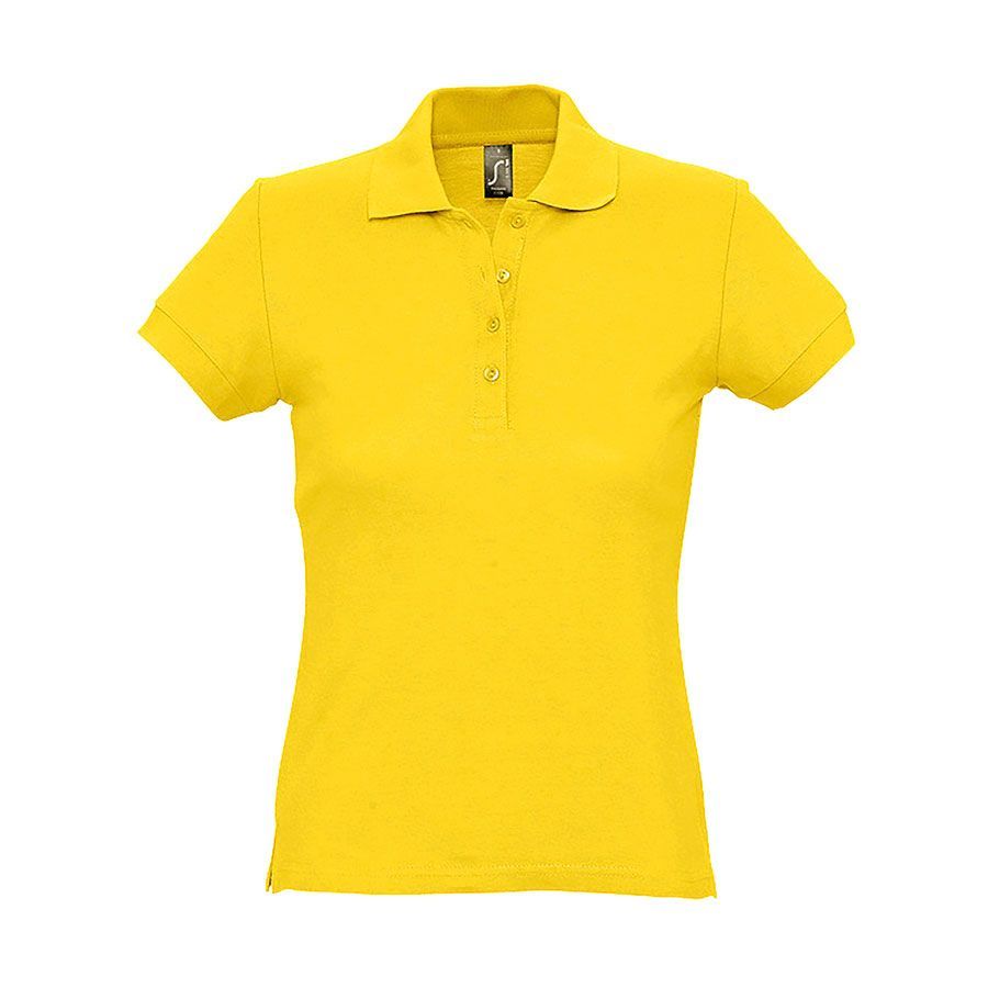 Приталенное женское поло.Прямой низ, боковые разрезы. Рукав короткий.Воротник и манжеты из эластичной резинки-рибаны.Ворот укреплен тесьмой.4 пуговицы в тон изделия на планке.Запасная пуговица на внутреннем боковом шве.Цвет близкий к PANTONE 1225C