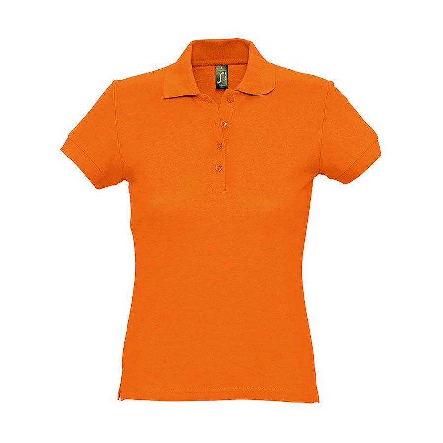 Приталенное женское поло.Прямой низ, боковые разрезы. Рукав короткий.Воротник и манжеты из эластичной резинки-рибаны.Ворот укреплен тесьмой.4 пуговицы в тон изделия на планке.Запасная пуговица на внутреннем боковом шве.Цвет близкий к PANTONE Orange 021C