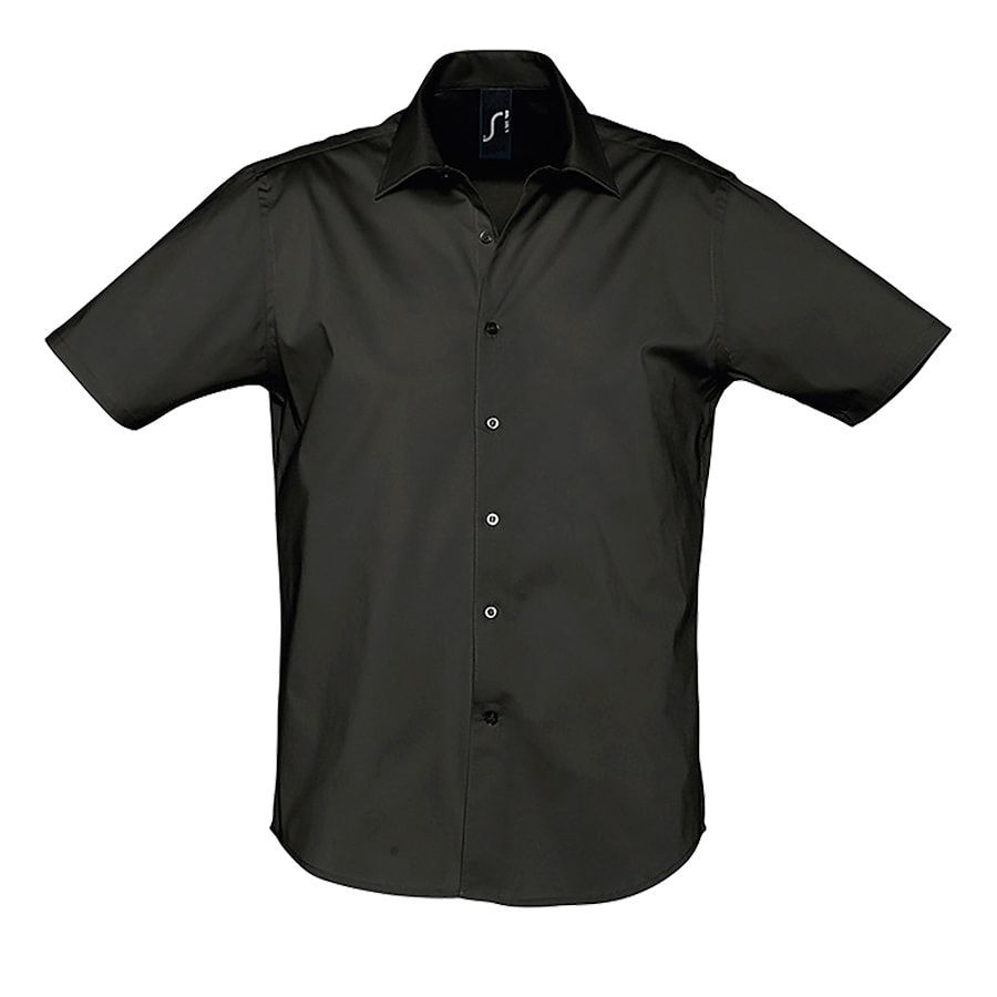 Мужская рубашка с коротким рукавом из ткани стрейч. Итальянский полуоткрытый воротник с 1 пуговицей. Облегающий крой, планка на 7 пуговиц в тон изделия.