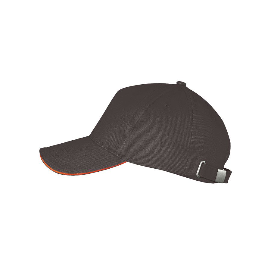 Бейсболка LONG BEACH без лобового шва с жестким козырьком "сэндвич". 4 вышитых люверса, регулируемая металлическая застежка. Цвет (оранжевый), близкий к PANTONE Orange 021C Цвет (тёмно-серый), близкий к PANTONE Cool gray 11C58 см - минимальный размер, с помощью застёжки его можно увеличить до необходимого.