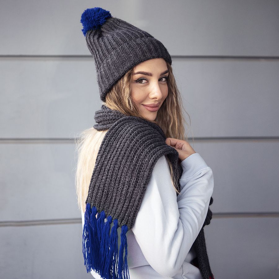 Мягкий, пушистый и уютный комплект из шарфа и шапки поможет согреться вам в холодное время года. Стильный меланжевый темно-серый цвет в средневековой Франции означал огромную власть. В те времена вся знать в основном одевалась в графитовые тона. Недаром, родилось выражение «серый кардинал». Почувствуйте магическое влияние серого цвета в сочетании с яркой отделкой!Цвет помпона и кисточек близкий к Pantone 287C