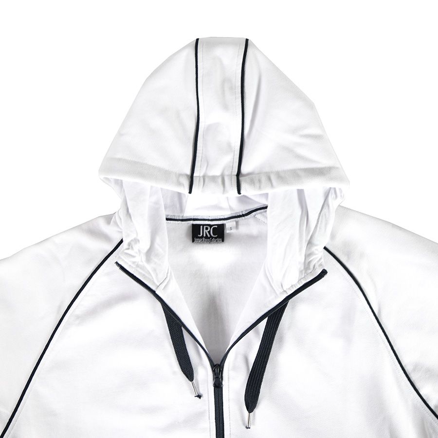 Основная ткань: цвет, близкий к Pantone Standart white Толстовка из полотна "пике" с водоотталкивающей пропиткой. Обратные контрастные молнии для предотвращения попадания влаги внутрь. Рукава-реглан. Декоративная тесьма по горловине спинки. Капюшон на подкладке с небольшой стойкой. Контрастные канты и шнур в капюшоне. Два передних кармана на молнии. Манжеты и низ изделия обработаны плотным рибом 1*1 . Представленные размеры могут отличаться от общепринятых. Рекомендуем взять образец для проверки посадки изделия на фигуре