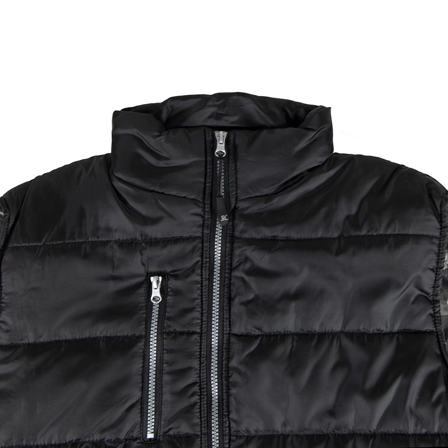 Основная ткань: цвет, близкий к Pantone 7547 С, подкладка: цвет, близкий к 404 U Небольшой воротник-стойка. Контрастная облегченная пластиковая молния со съемным пуллером. Три передних кармана на молнии. Внутренний карман на липучке. Контрастная подкладка камуфляж.