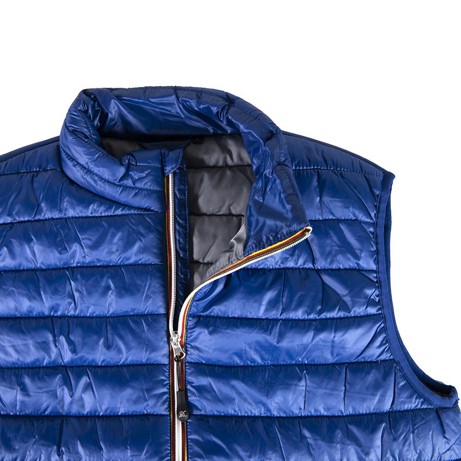 Основная ткань: цвет, близкий к Pantone 539 U, подкладка: цвет, близкий к Pantone 430 C Легкий жилет из нейлона. Небольшой воротник-стойка. Контрастная облегленная пластиковая молния со съемным пуллером. Два передних кармана на молнии. Один внутренний карман на липучке. Cтягивающая эластичная резинка по низу изделия и в рукавах.