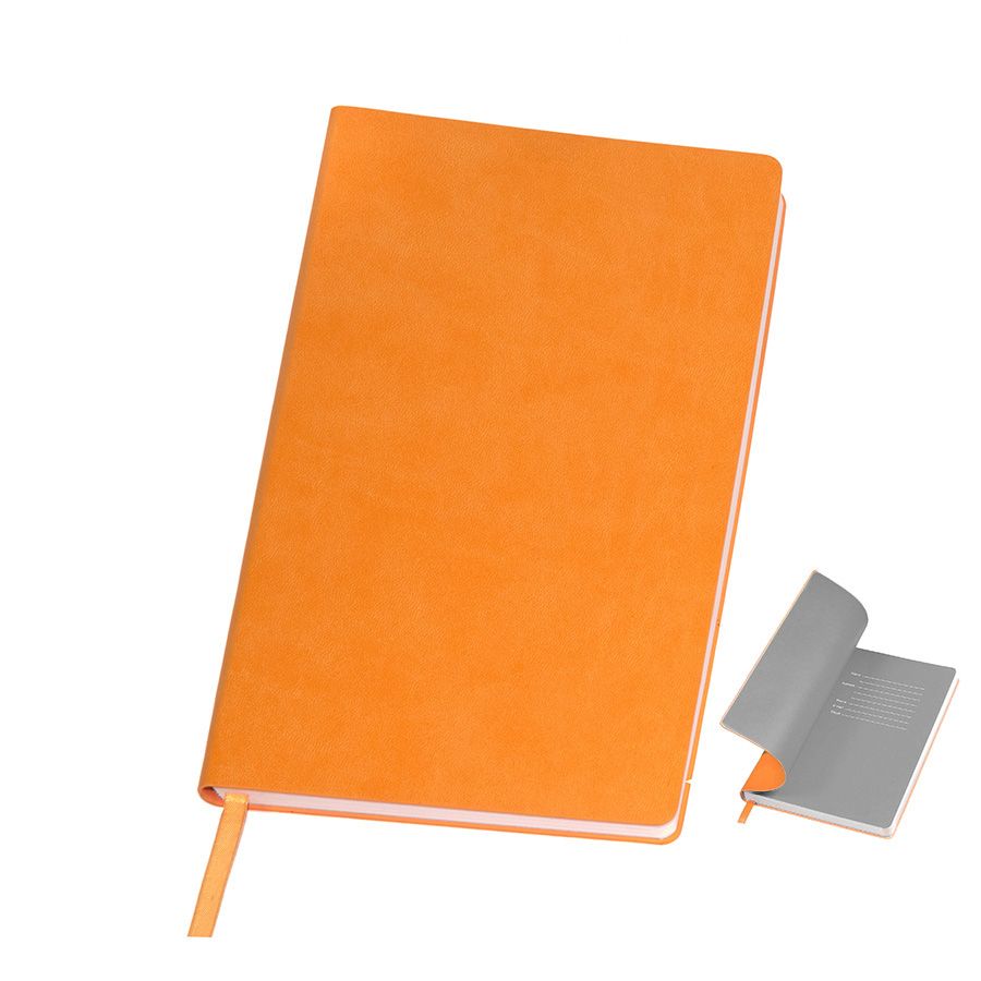 Блокнот с мягкой термоактивной обложкой и популярной комбинацией цветов Термоактивный PU материал Velvet Цвет обложки, близкий к Pantone 158C Цвет форзаца, близкий к Pantone Cool Gray 5U Внутренний блок 256 страниц в линейку Идеально скругленные углы блока Перфорированные 8 последних листов Кремовая FSC бумага 70 г м2 Ляссе в тон обложки Индивидуальная упаковка: фирменный сливбокс thINKme