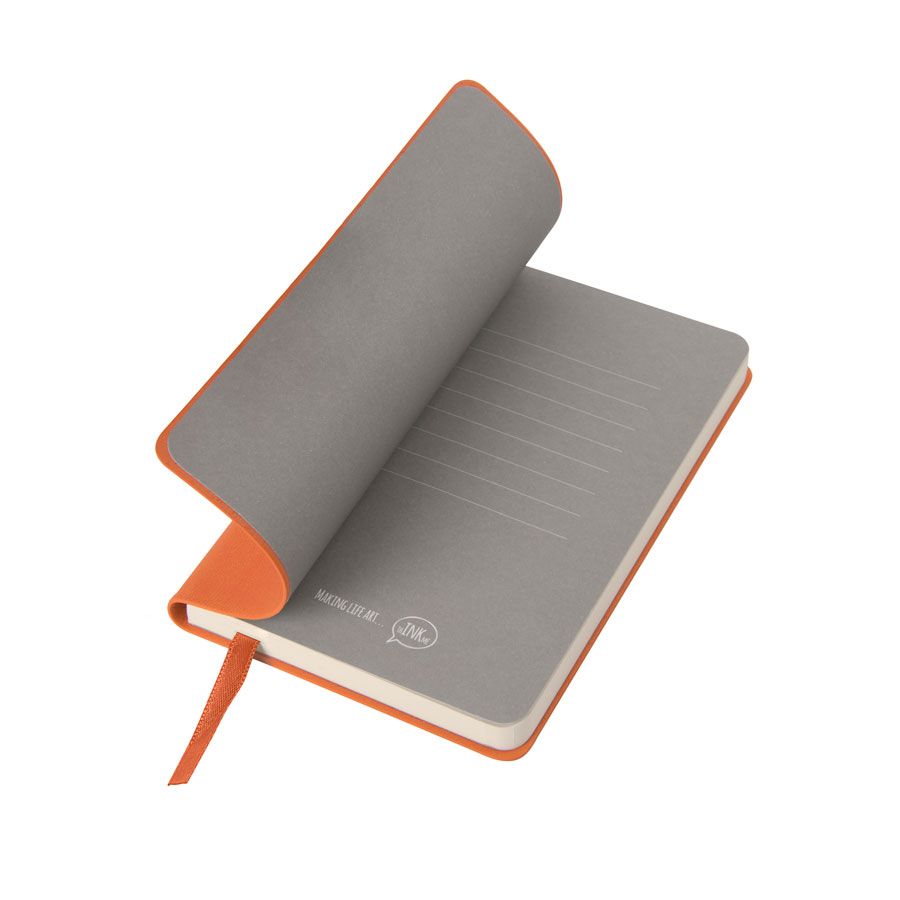 Блокнот с мягкой термоактивной обложкой и популярной комбинацией цветов Термоактивный PU материал Velvet Цвет обложки, близкий к Pantone 158С Цвет форзаца, близкий к Pantone Cool Gray 5U Внутренний блок 192 страницы в клетку Идеально скругленные углы блока Перфорированные 8 последних листов Кремовая FSC бумага 70 г м2 Ляссе в тон обложки Фирменный сливбокс thINKme