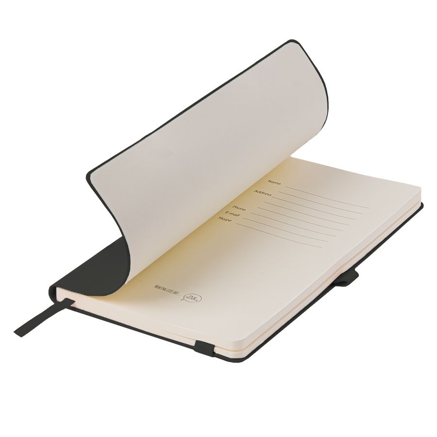 Soft-touch блокнот с покрытием, защищающим от царапин FSC сертификат Мягкая термоактивная обложка PU нового поколения Silk Plus Пантон, близкий к BlackC Кремовая бумага (блок 70 гр, форзац 160 гр) Блок 192 стр. в линейку Перфорация 8 последних листов. Ляссе в тон обложке. Практичные закругленные углы. Надежный прошитый переплет. Упаковка: фирменный слив-бокс