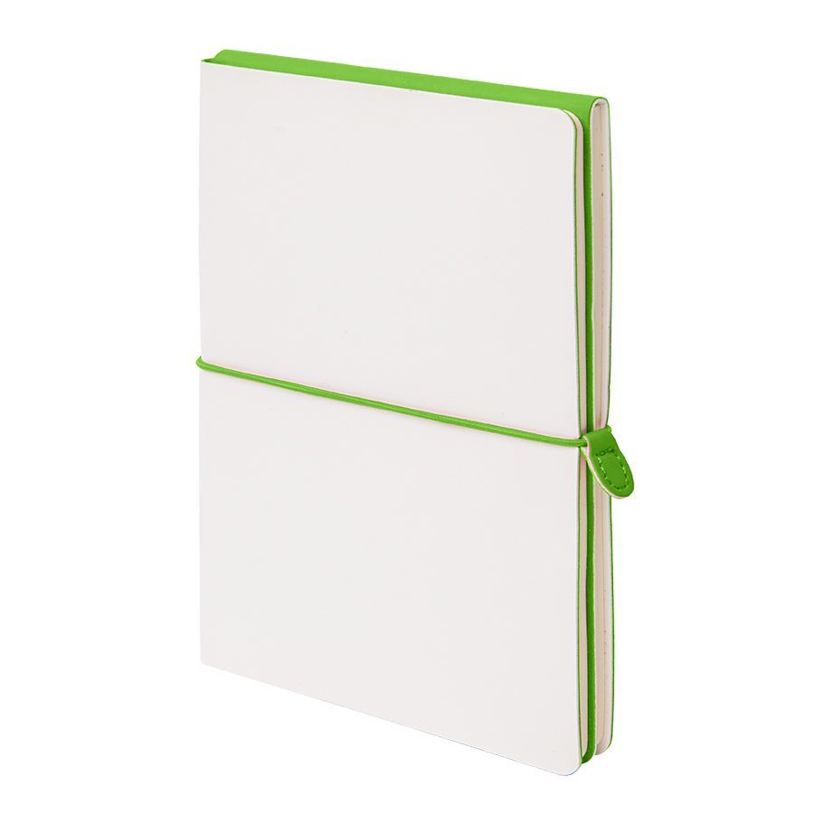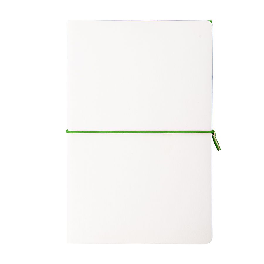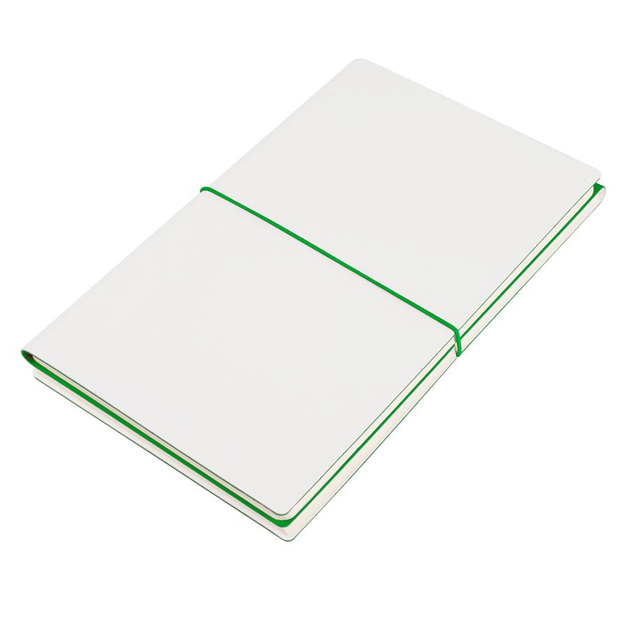 COMBI – Размер блокнота 130*210 мм- два направления открытия блокнота: с лицевой стороны – традиционное горизонтальное раскрытие, с оборотной стороны – вертикальное раскрытие, а-ля блокнот «reporter».- два разных материала обложки: с лицевой стороны – имитирующий настоящую кожу PU Shevret (цвет - белый),с оборотной стороны - яркий PU Silk Plus (цвет, близкий к pantone 355C). - два разных внутренних блока по 96 страниц соединены под одной обложкой:первый блок - в клетку, второй – нелинованный c перфорацией.Гибкий переплет. Горизонтальная резинка с PU клипом с функцией пенхолдераИдеально скругленные углы блока. Кремовая eco-friendly эвкалиптовая FSC бумага 70 г м2.