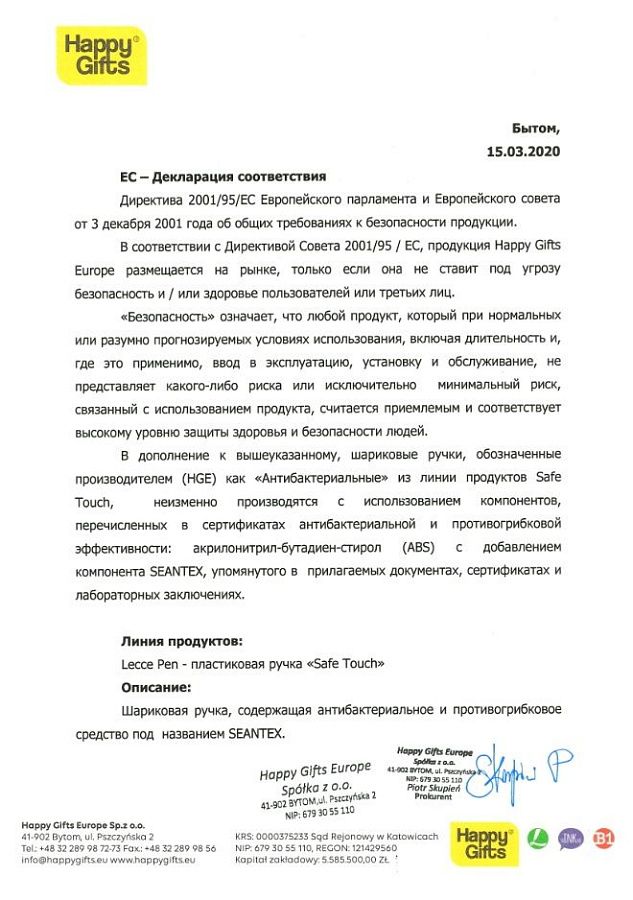 Pantone, близкий к 656U. Стержень X-20 с синими чернилами Dokumental и толщиной пишущего узла 1 мм. Обеспечивает до 2000 м письма. Коллекция ручек SafeTouch из антибактериального пластика создана для мест, где важна забота о чистоте и стерильности. Например, медицинских лабораторий и клиник, для мест массового оформления документов - банков, госучерждений, зон клиентского сервиса, где посетители используют одну и ту же ручку. Благодаря специальному компоненту SEANTEX, который используется при производстве ручек SafeTouch, снижается риск накопления бактерий на поверхности ручек в течение дня. Антибактериальные свойства пластика, из которого производятся ручки SafeTouch, подтверждены лабораторными исследованиями, выполненными по международному стандарту ISO 22196:2011. Материал безопасен для кожи и сохраняет свои свойства в течение всего срока службы ручек. ___ Дополнительные файлы: - заключение о результатах испытаний пластика c антибактериальной добавкой SEANTEX по стандарту ISO 22196:2011; - свидетельство о безопасности антибактериальной добавки SEANTEX, выданное компании-производителю добавки; - официальное письмо о безопасности материалов ручек SafeTouch.