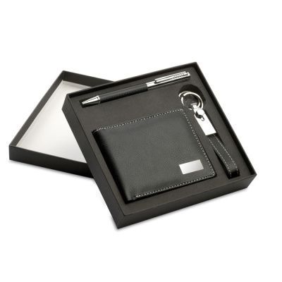 Элегантный подарочный набор в картонной коробке. Включает поворотную шариковую ручку с синими чернилами, стильный брелок для ключей и кошелек из искусственной кожи.