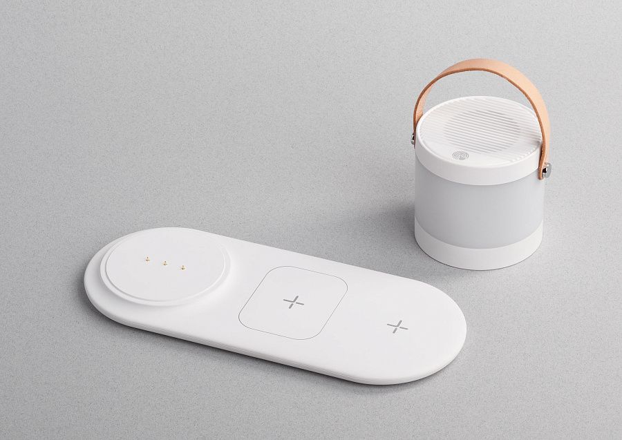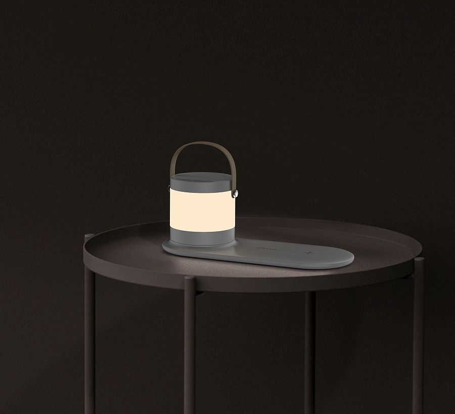 Настольный набор из мобильной bluetooth колонки-лампы и беспроводной зарядной станции с увеличенной мощностью передачи заряда (15W) для смартфона и наушников. Лампа-ночник управляется сенсорной кнопкой и имеет 2 режима светового потока – тёплый и холодный.
