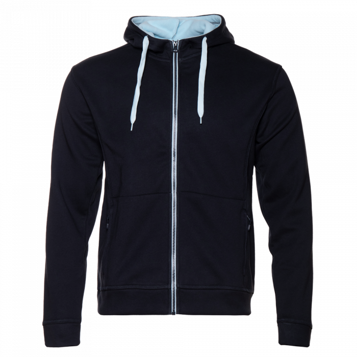 Мужская толстовка прямого силуэта с капюшоном комфортной глубины, втачным рукавом, прорезным карманов и застежкой на контрастную молнию. Капюшон дополнен плоским шнурком для регулировки прилегания, манжет и низ изделия выполнены из основного полотна.
