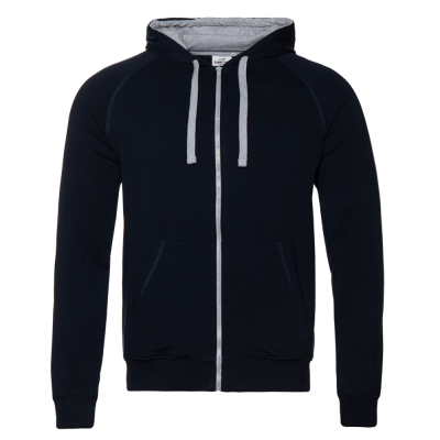Мужская толстовка прямого силуэта с капюшоном комфортной глубины, рукавом-реглан, глубоким накладным карманом и застежкой на молнию контрастного цвета. Капюшон дополнен шнурком для регулирования прилегания, манжет и низ изделия оформлены широкой эластичной резинкой.