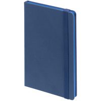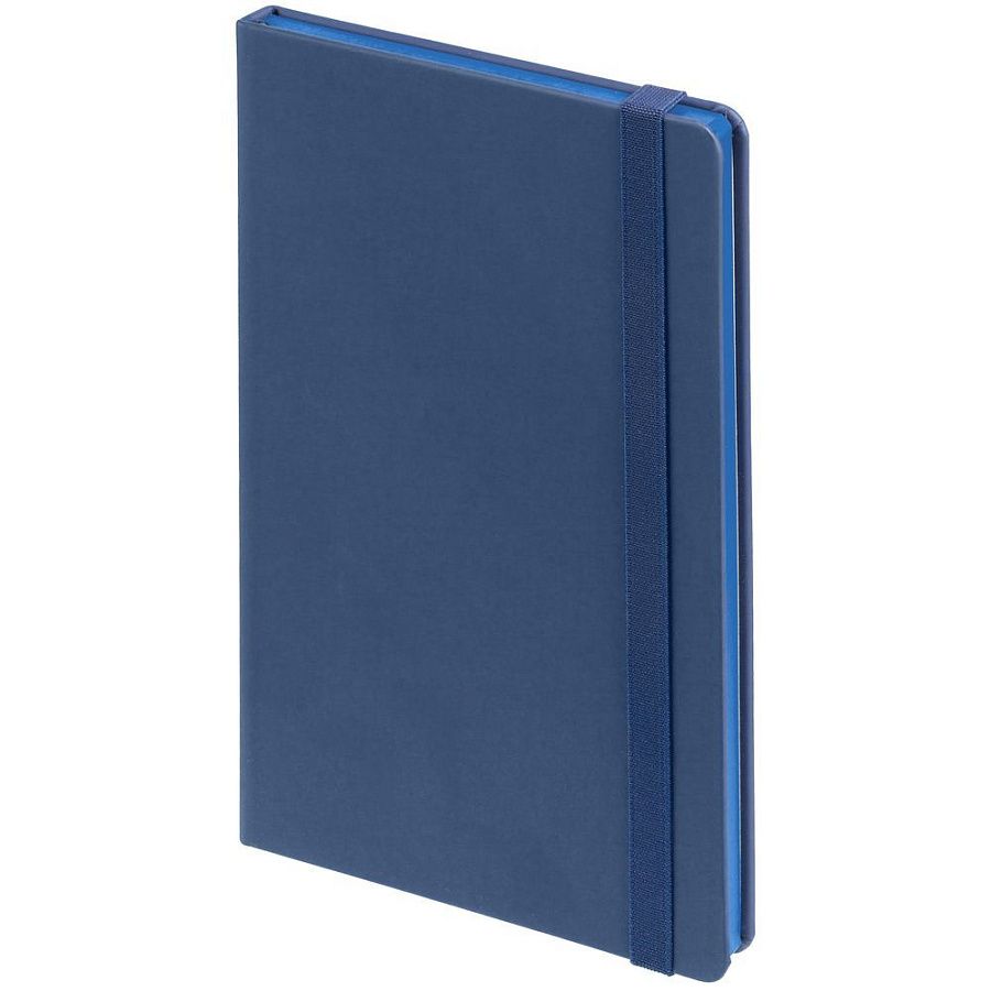 Блокнот в твердой обложке, выполнен из материала Soft Touch Pearl, синий НН, дополнен резинкой и ляссе в цвет обложки.