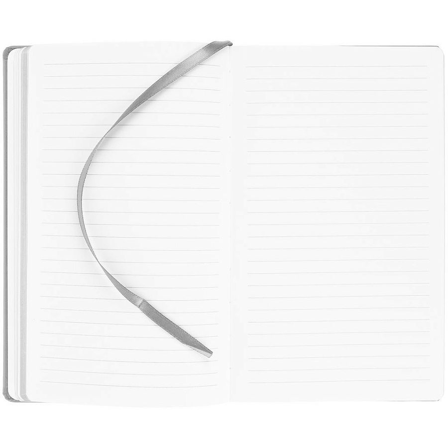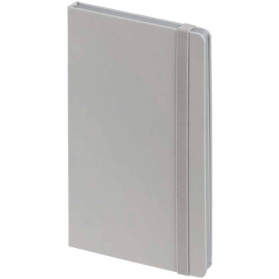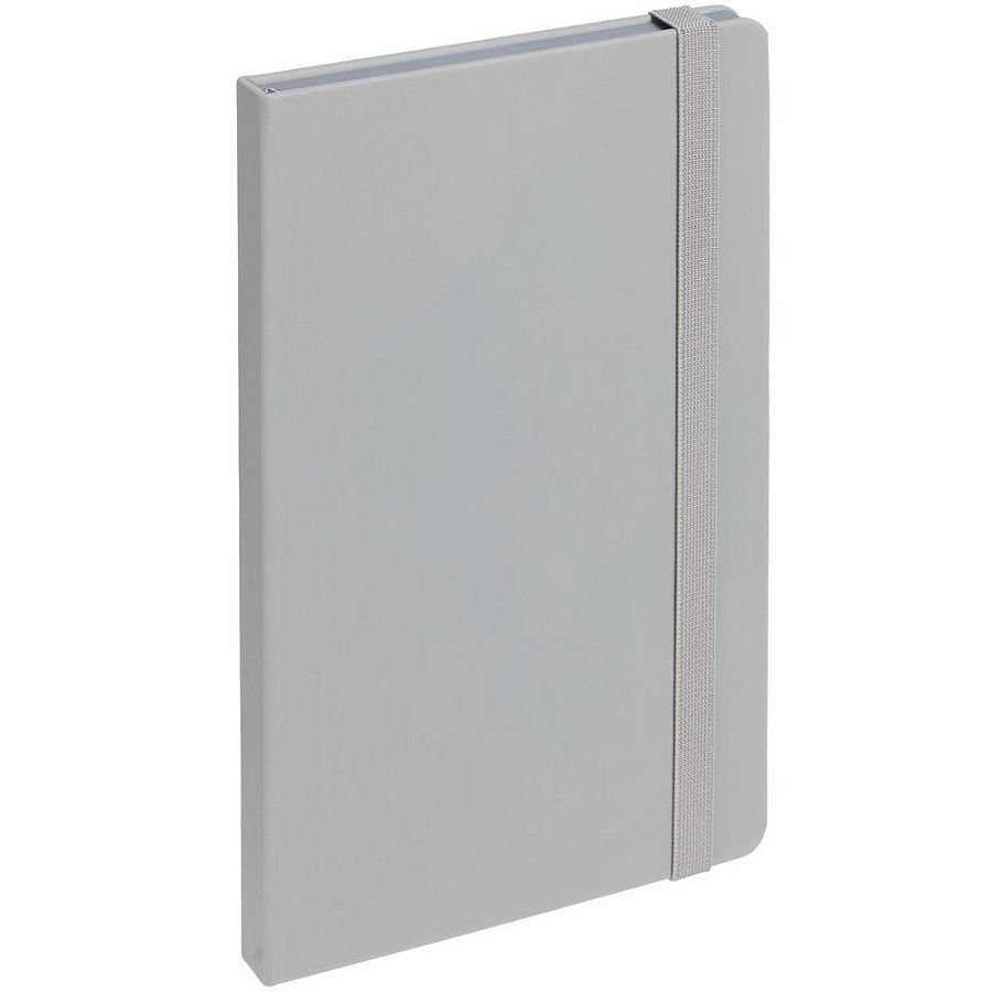 Блокнот в твердой обложке, выполнен из материала Soft Touch, серый СС, дополнен резинкой и ляссе в цвет обложки.